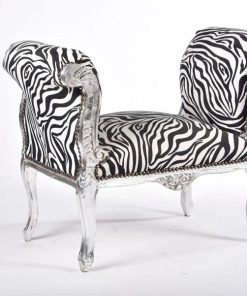 Panchetta da camera in legno laccato argento, rivestita in tessuto zebrato. Ideale da accompagnare a poltrone o sedie dallo stesso design, il divanetto barocco, donerà ai tuoi ambienti un tocco di pura regalità.
