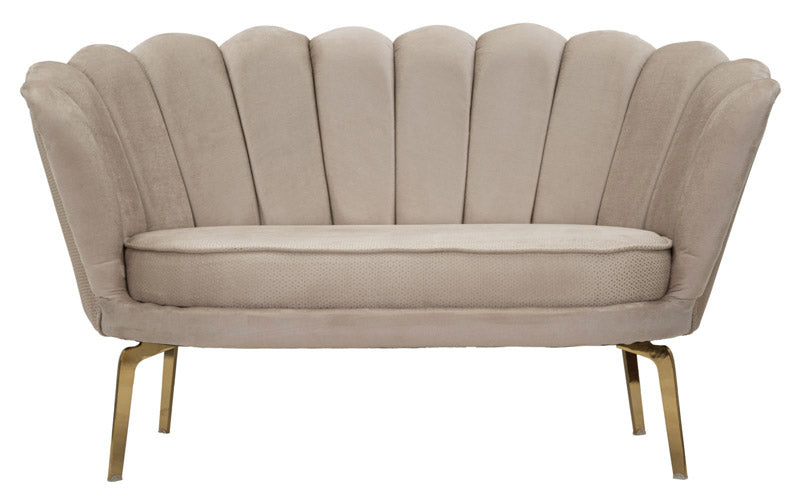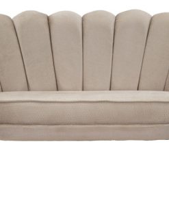 Divano due posti interamente rivestito in morbido tessuto effetto velluto, affascinate grazie allo schienale che ricorda la forma di un fiore, con petali scanditi da cuciture verticali per meglio rappresentare questo modello così richiesto. La seduta accompagna le forme tondeggianti dello schienale, dotata di elementi che garantiscono comfort come l’imbottitura in spugna e il cuscino alto. Le gambe in metallo dorato ultimano l’eleganza di questo divano, da correlare con la poltrona dello stesso design per ottimizzare un salotto glamour.