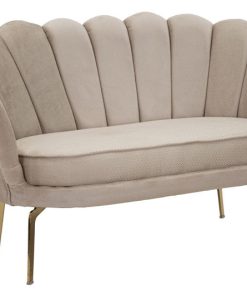 Divanetto design dalla forma a fiore, rivestito in tessuto effetto velluto disponibile nei colori crema o nero con cuscino rivestito con una graziosa fantasia tono su tono. Dotato di tanta imbottitura, il nostro divano design assicura comodità, sostenuto da gambe in metallo verniciato oro dal design moderno e innovativo.