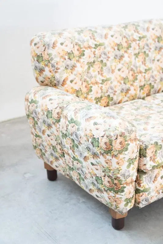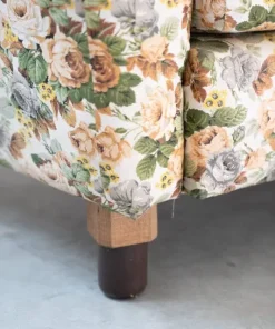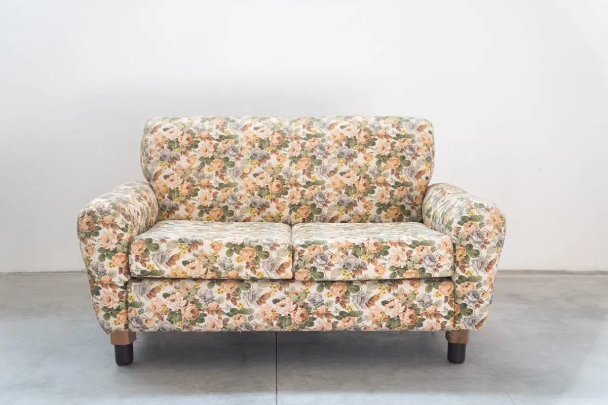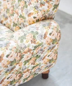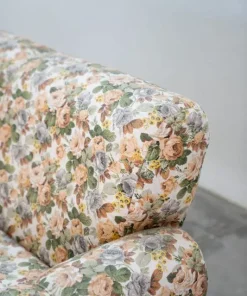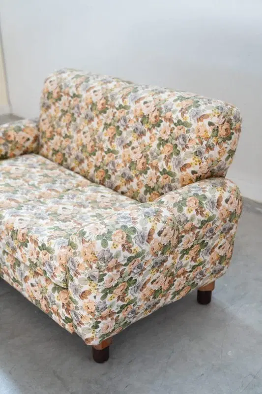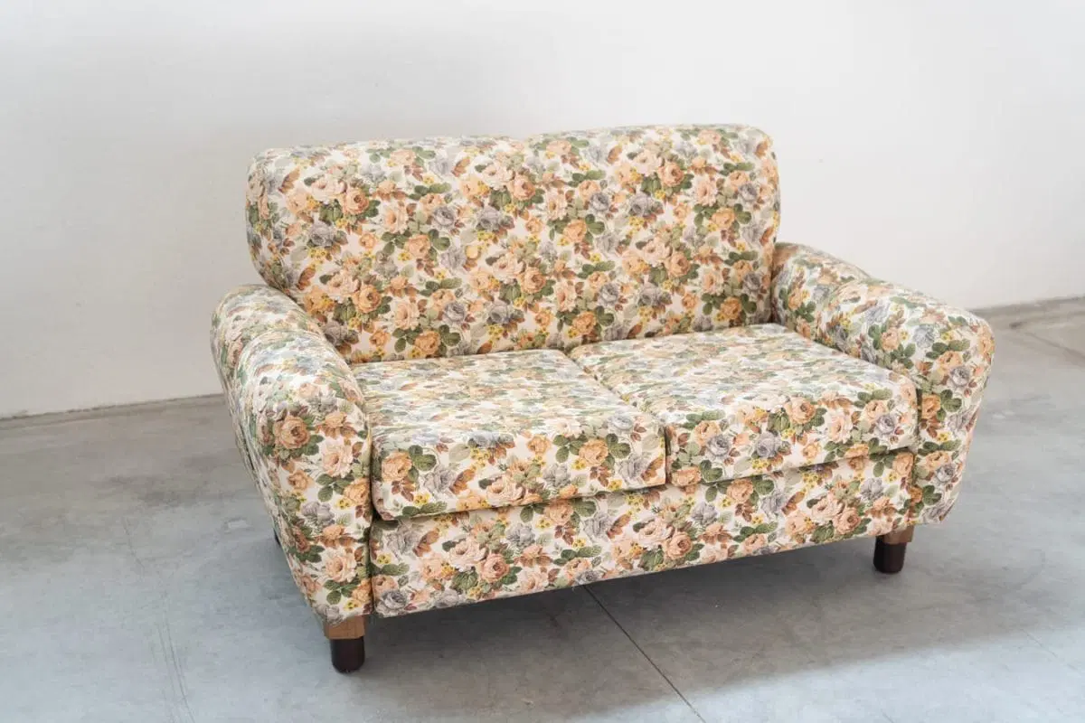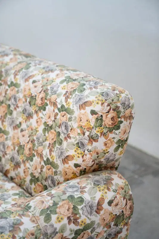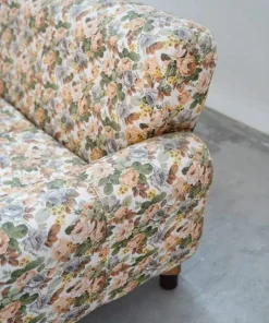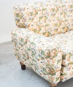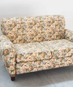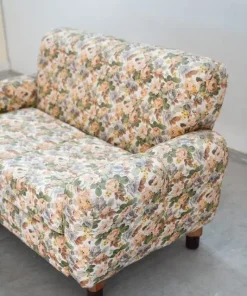 Divano 2 posti, tessuto floreale, struttura in legno, piedini in plastica e legno, 1970