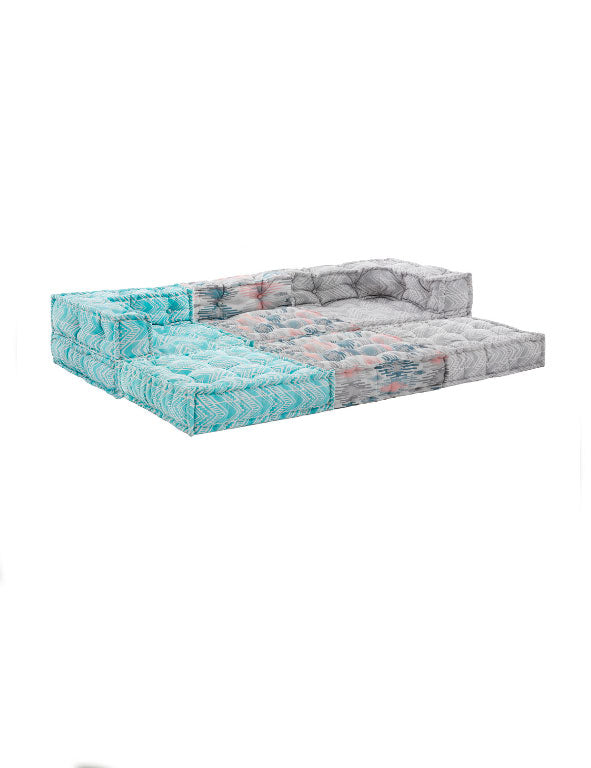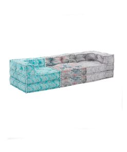 Divano 3 posti, in tessuto idrorepellente, multicolorato. Componibile a vostro piacimento, grazie alla sua struttura data da 2 elementi angolari, 1 centrale e 3 pouf quadrati.
