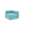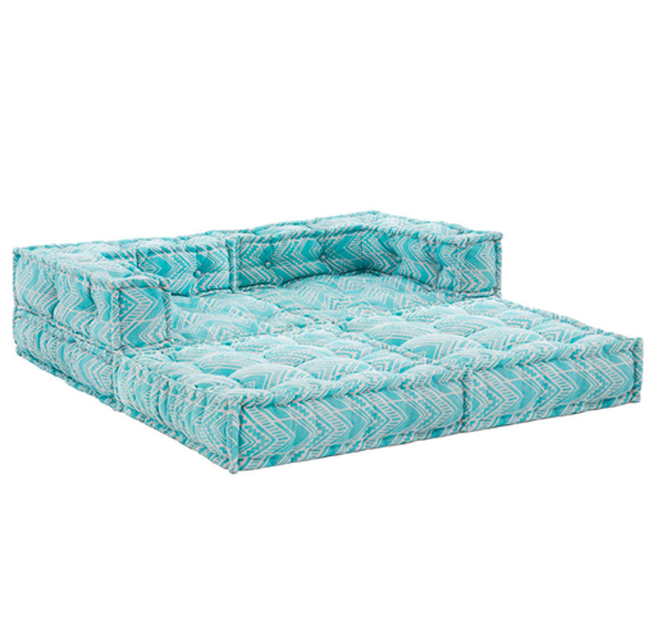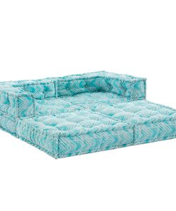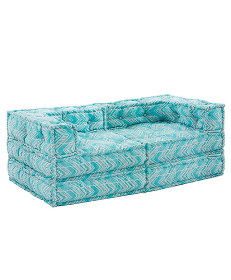 Divano 2 posti, in tessuto idrorepellente, disponibili in 3 colori differenti: celeste, grigio o celeste e grigio. Componibile a vostro piacimento, grazie alla sua struttura data da 2 elementi angolari e 2 pouf quadrati.