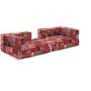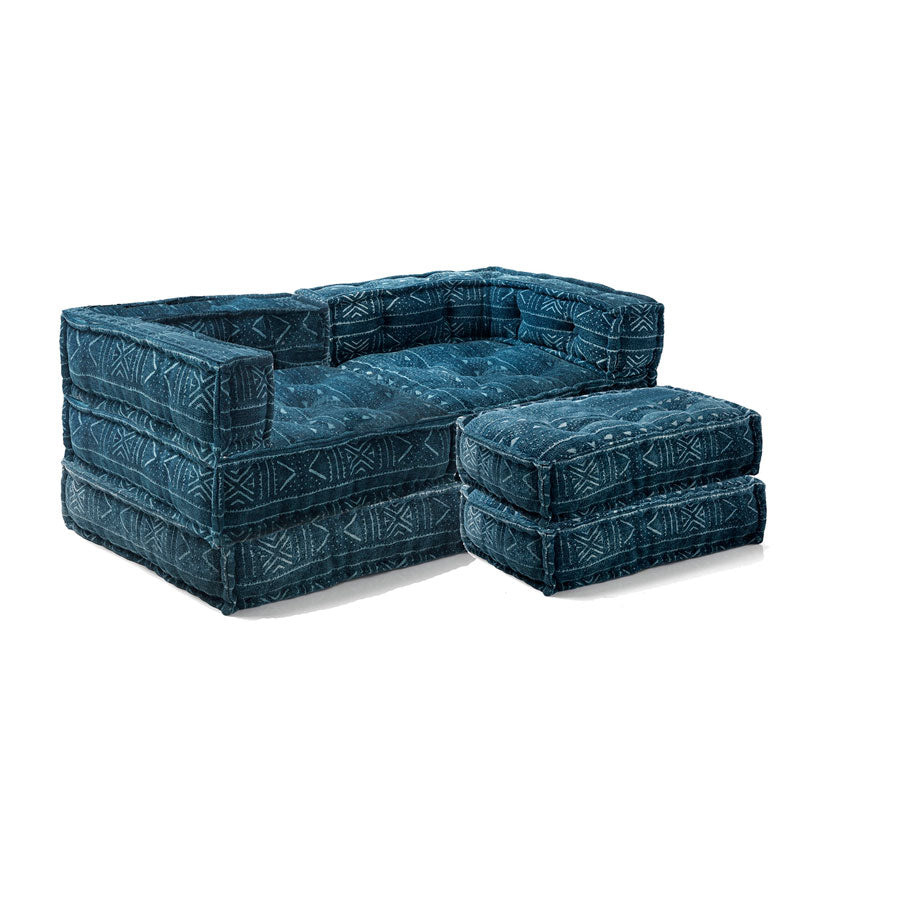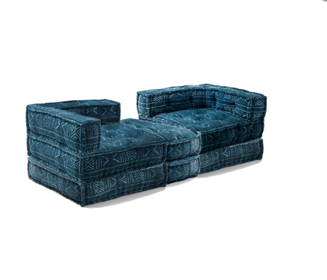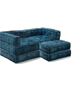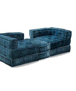 Divano due posti da terra, componibile, in quanto formato da 4 complementi: due elementi angolari e due cuscini quadrati, da utilizzare come base o come estensione del divano stesso, formando, ad esempio, un comodo letto. Questo divano moderno si presenta piacente per il rivestimento in cotone, di colore scuro, ottimo per chi vuole arredare in stile etnico.