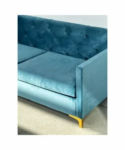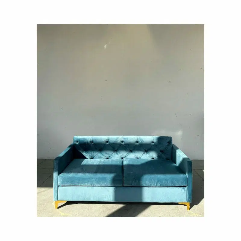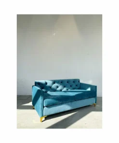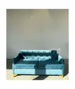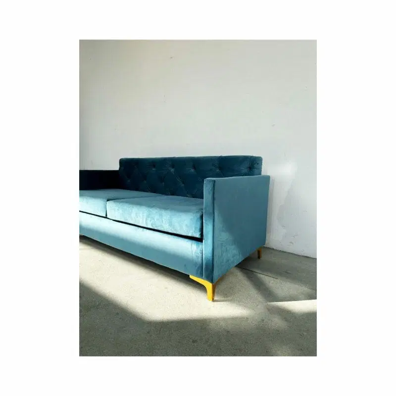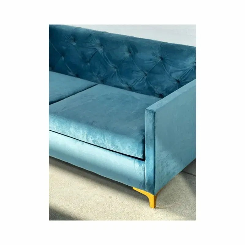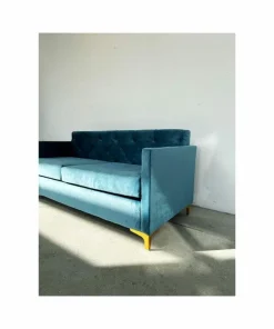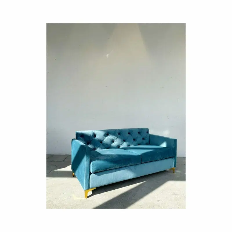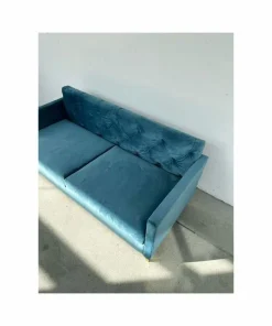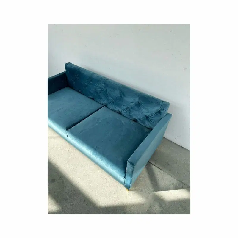 Divano anni ’60, in velluto di seta blu, schienale in capitonnè. Piedini in ottone