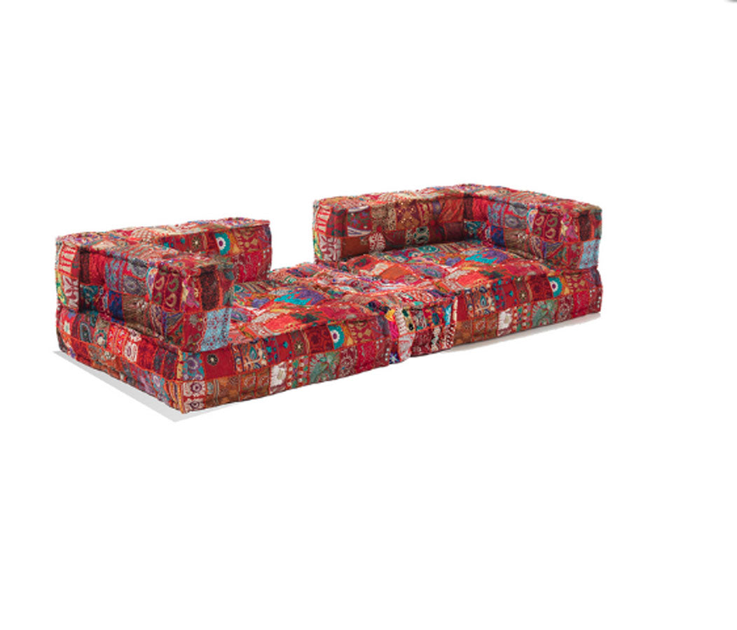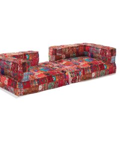 Divano moderno biposto, rivestito in cotone, realizzato artigianalmente con tecnica patchwork. Il divano da salotto offre una seduta morbida e comodissima, ottenuta dai due elementi angolari che lo compongono. Colorato e fantasioso, per dare un tocco giovanile alla vostra stanza.