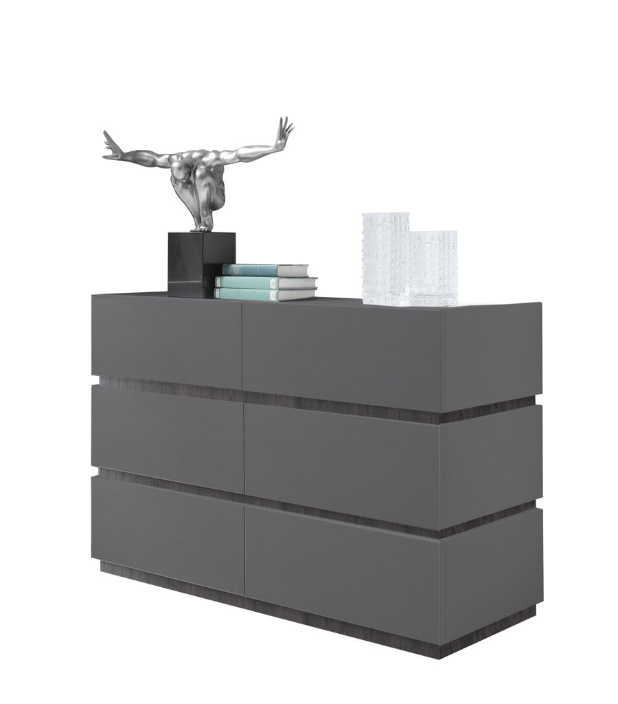 Cassettiera 6 cassetti Donald realizzata in legno grigio opaco, un mobile funzionale e pratico adattabile dappertutto e distinto da un design estremamente lineare. Donald presenta inserti e zoccolo colore wengé o in colore grigio.