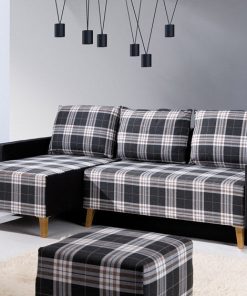 Divano angolare trasformabile in letto e dotato di utile funzione contenitore. Il letto moderno Donara si presta per creare un salotto o soggiorno super confortevole, infatti, si presenta ampio, morbido, completo di cuscini e con la possibilità di trasformarsi in poco tempo, in un letto da cm 200×140. Rivestito interamente in tessuto, Donara si contraddistingue anche per la fantasia scozzese abbinata al grigio scuro, da associare alla poltrona e pouf della stessa linea.