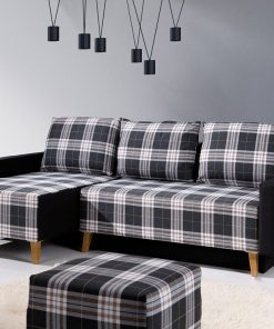 Divano angolare trasformabile in letto e dotato di utile funzione contenitore. Il letto moderno Donara si presta per creare un salotto o soggiorno super confortevole, infatti, si presenta ampio, morbido, completo di cuscini e con la possibilità di trasformarsi in poco tempo, in un letto da cm 200×140. Rivestito interamente in tessuto, Donara si contraddistingue anche per la fantasia scozzese abbinata al grigio scuro, da associare alla poltrona e pouf della stessa linea.