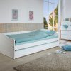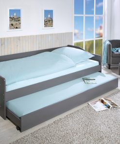 Letto singolo con secondo letto a scomparsa collocato nella parte inferiore, facilmente estraibile e pronto all’uso. Dualy è prodotto in legno massello di pino colore grigio. progettato come elemento funzionale, utile per guadagnare spazio all’interno della cameretta.