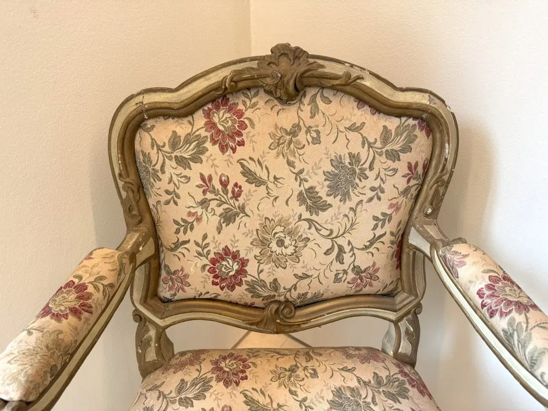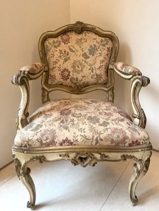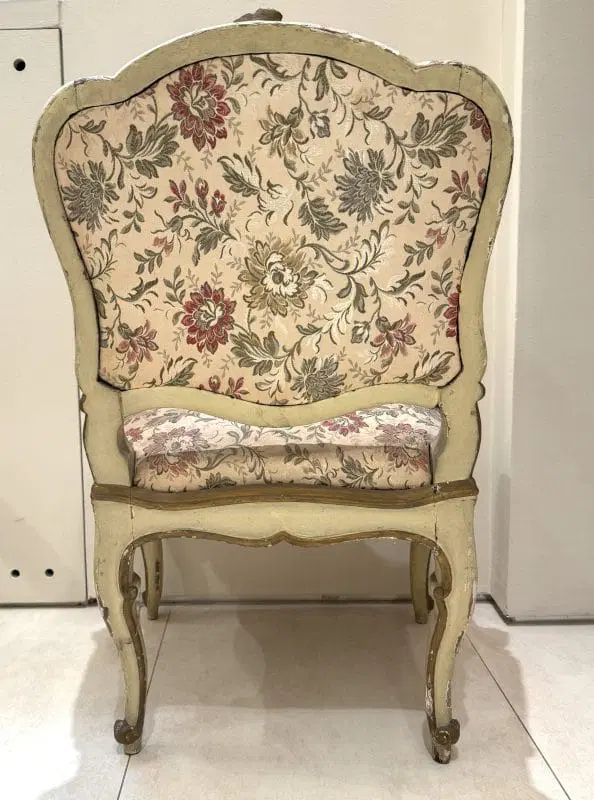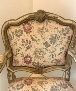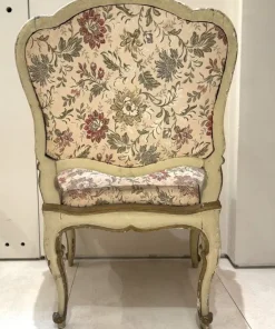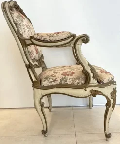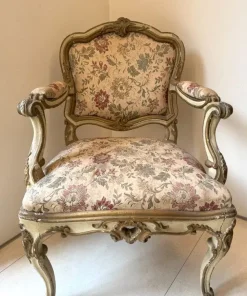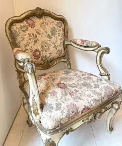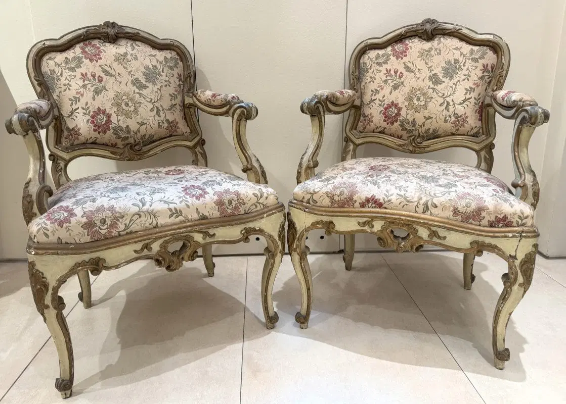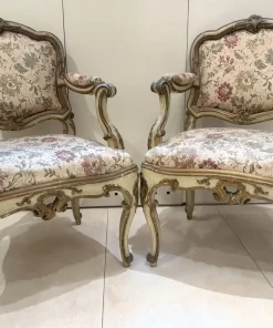 Due poltrone in legno laccato e dorato, Lombardia, XVIII secolo, profili sagomati decorati da piccole volute, schienale centrato da un motivo roccailes, cintura intagliata, gambe arcuate terminati a ricciolo su puntale, tessuto operato a fiori policromi su fondo avorio, (laccatura e doratura riprese) cm 98x65x60