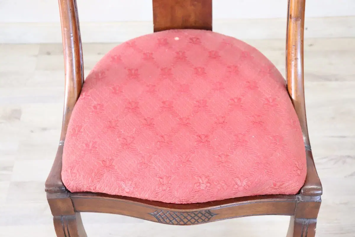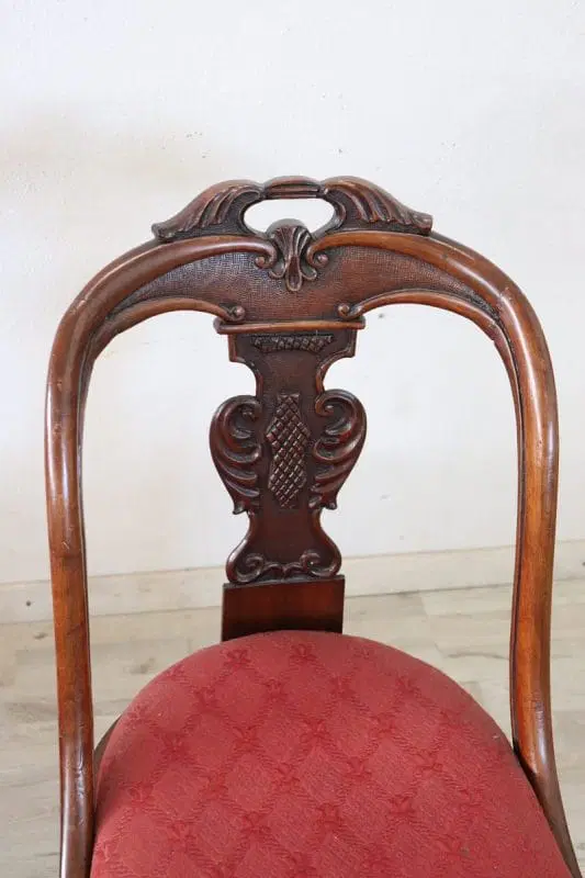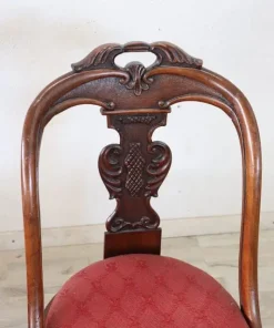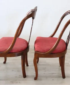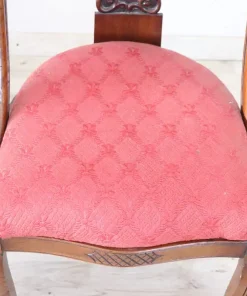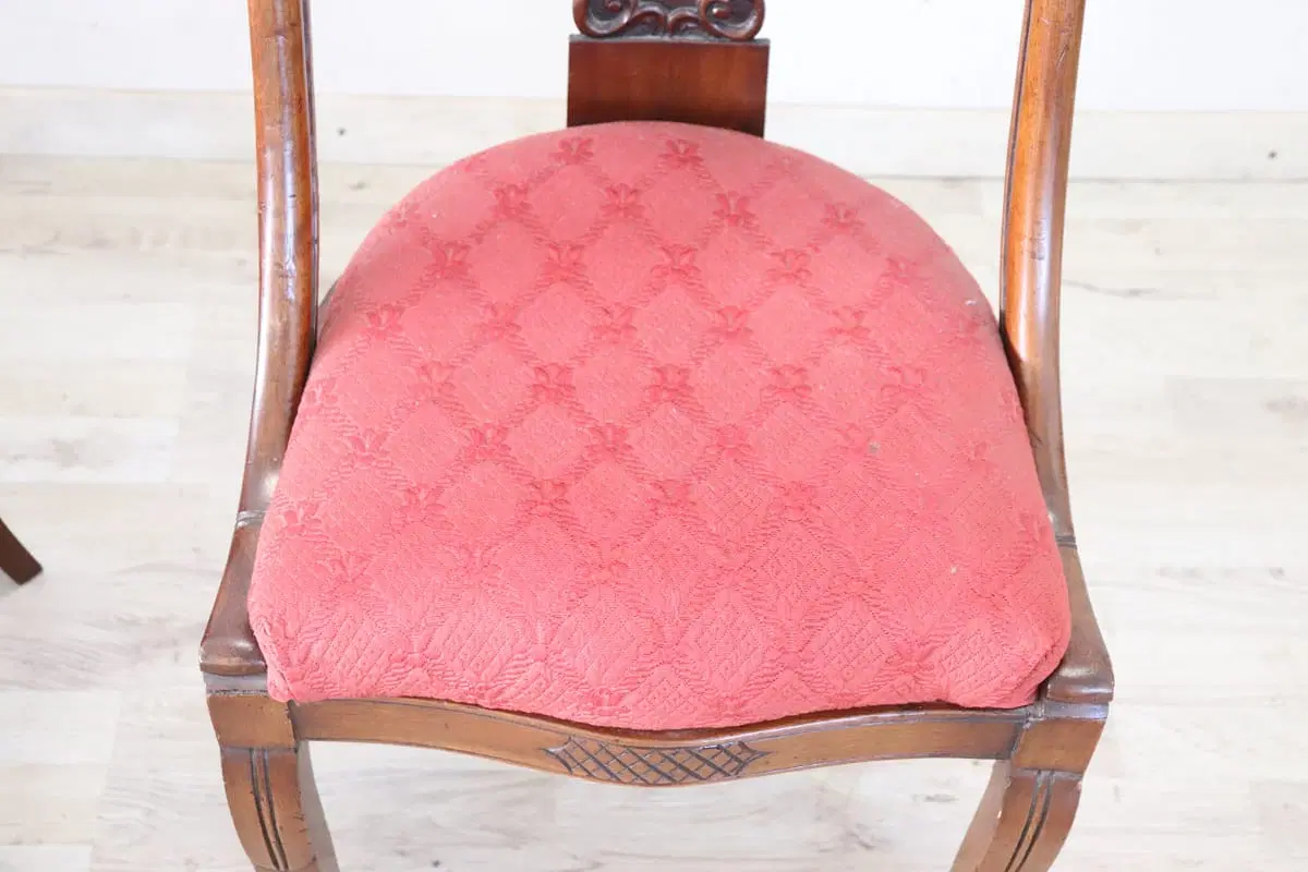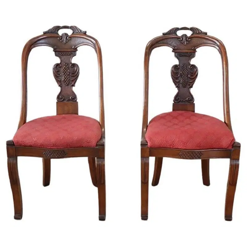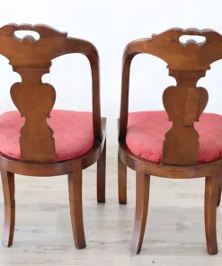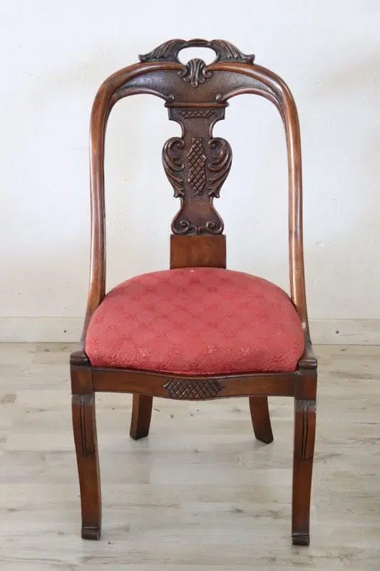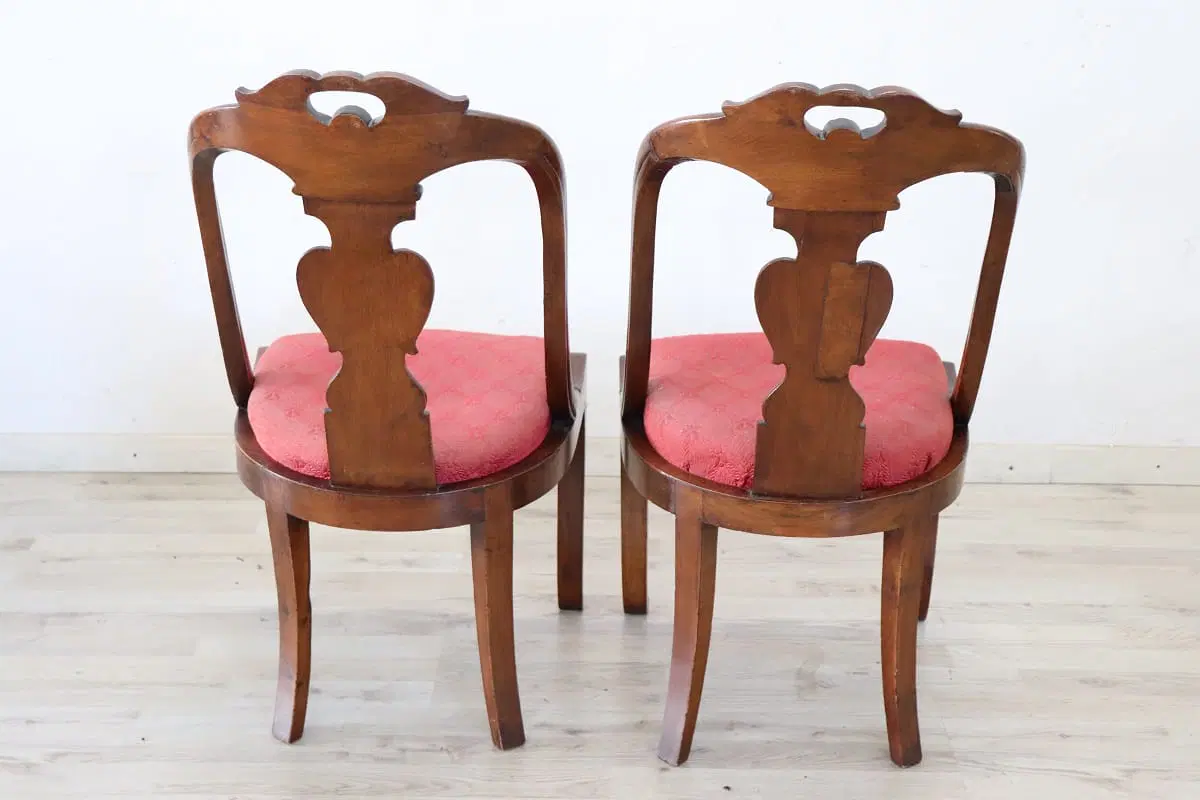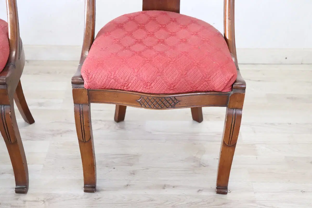 Bellissimo set di due sedie antiche in legno di noce massello prima metà del XIX secolo periodo Carlo X ebanisteria italiana. Caratterizzate da uno schienale avvolgente e raffinato, impreziosito da un’elaborata decorazione intagliata a mano nel legno di noce. La seduta è ampia e confortevole con imbottitura rivestita in elegante tessuto rosso. Ottime condizioni del legno leggera usura del tessuto e dell’imbottitura, si consiglia sostituzione. Prezzo trattabile vi invitiamo ad inviarci le vostre proposte di acquisto le valuteremo con piacere. Vi consigliamo comunque di guardare bene in dettaglio tutte le foto allegate.