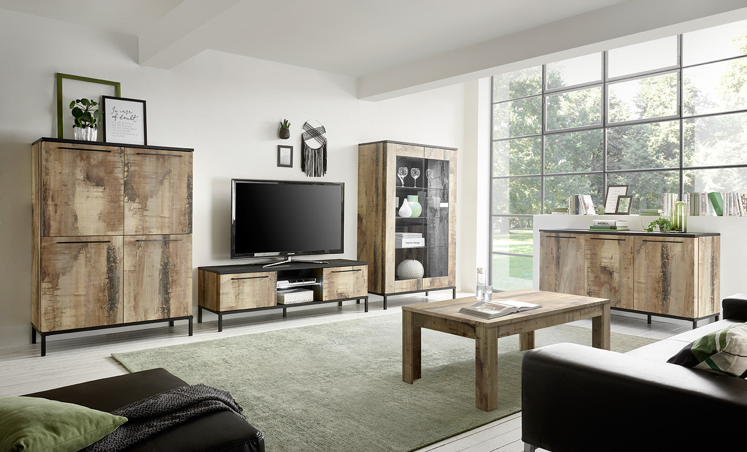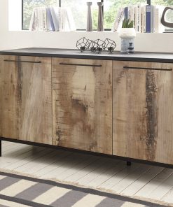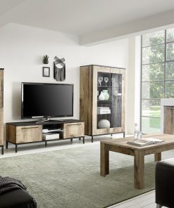 Salotto completo Durango costituito da vetrina, credenza alta a 4 ante, madia a 3 ante e tavolino da fumo in legno colore pero. Tutto ciò per rendere la tua casa in perfetto stile industrial, attuale e con tanti mobili capienti.