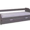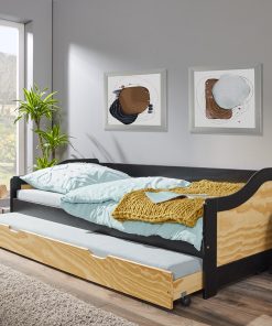 Letto singolo con secondo letto estraibile Ebony completo di doghe, ideale per la cameretta dei ragazzi e progettato come elemento funzionale e salvaspazio. Il letto Ebony è prodotto in legno massello di pino colore naturale contrastato da cornici di colore nero, caratteristica che lo connota e lo rende ancora più moderno e audace.