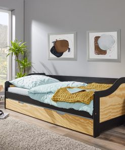 Letto singolo Ebony, un’altra fantastica soluzione con doppio letto per camerette di piccole dimensioni. Infatti Ebony, presenta un cassettone inferiore, facile da estrare con apposite ruote, dove potrete collocare un secondo letto. Completo di doghe, il letto moderno Ebony è realizzato in legno massello di pino in un particolare binomio di colori: naturale e nero.