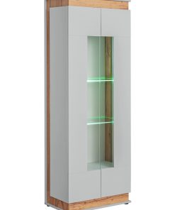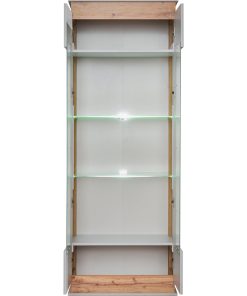 Interessante vetrina moderna Egida alta cm 190. capiente e con un aspetto distinto e raffinato. La forma semplice e squadrata, mette in evidenza le ante colore bianco che inquadrano la parte vetrata con ripiani in vetro e luci a led per realizzare un effetto più suggestivo. Inoltre, gli inserti rovere chiaro aggiungono un dettaglio significativo per connotare e rendere armonica questa bellissima vetrina alta.
