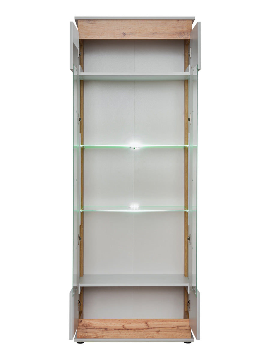 Vetrina alta Egida fornita di 4 ripiani interni, di cui 2 in vetro accompagnati da luci a led per illuminare e rendere più belli gli oggetti esposti. Egida è realizzata in legno grigio chiaro e piacevoli inserti rovere chiaro.