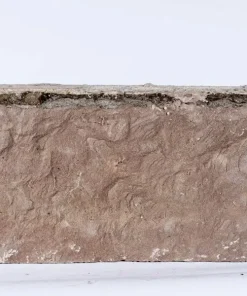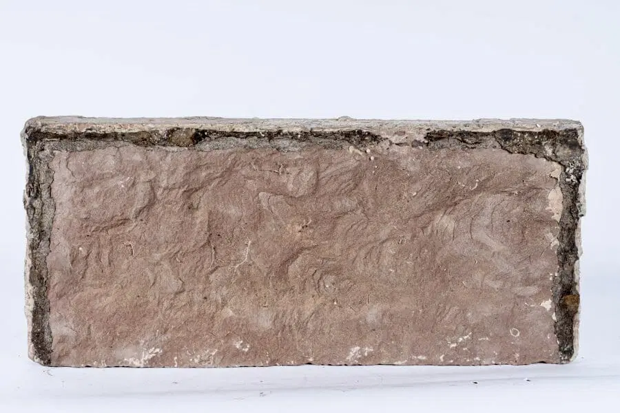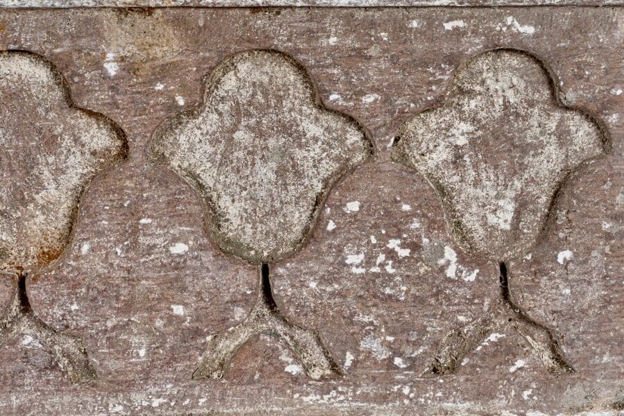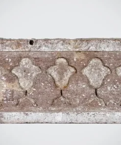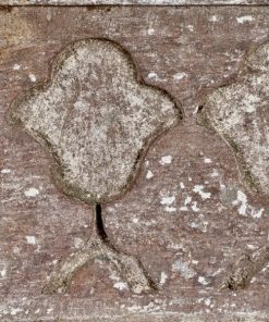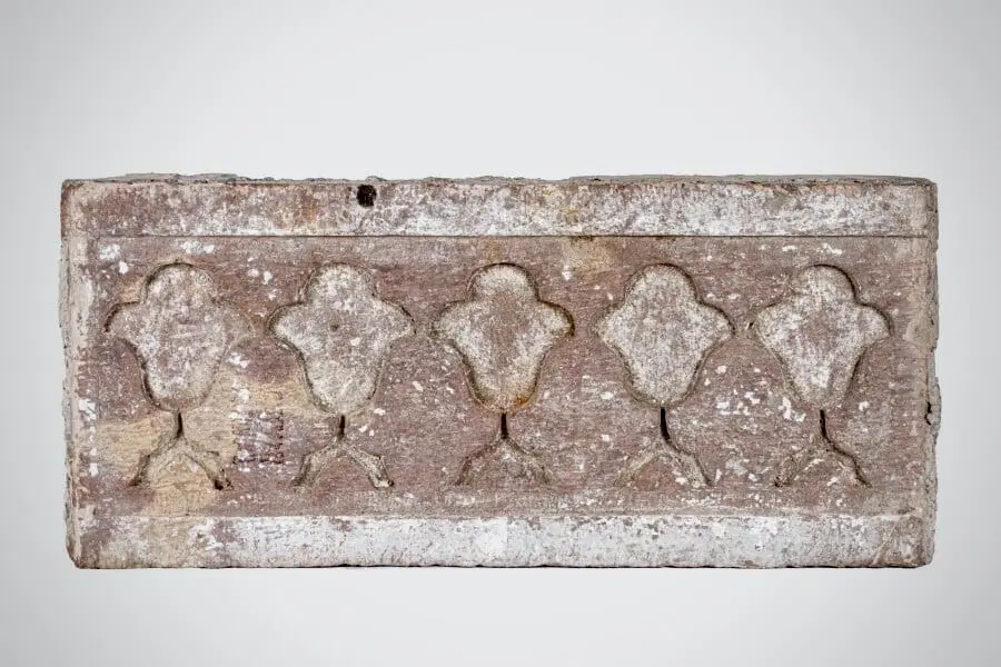 Elemento architettonico parietale in arenaria rossa scolpita con in disegno ornamentale ripetuto che riflette la Khamsa, la mano di Fatima, una decorazione amuletica caratteristica del mondo islamico. Le Khamsa si succedono disposti alternativamente verso l’alto e verso il basso.