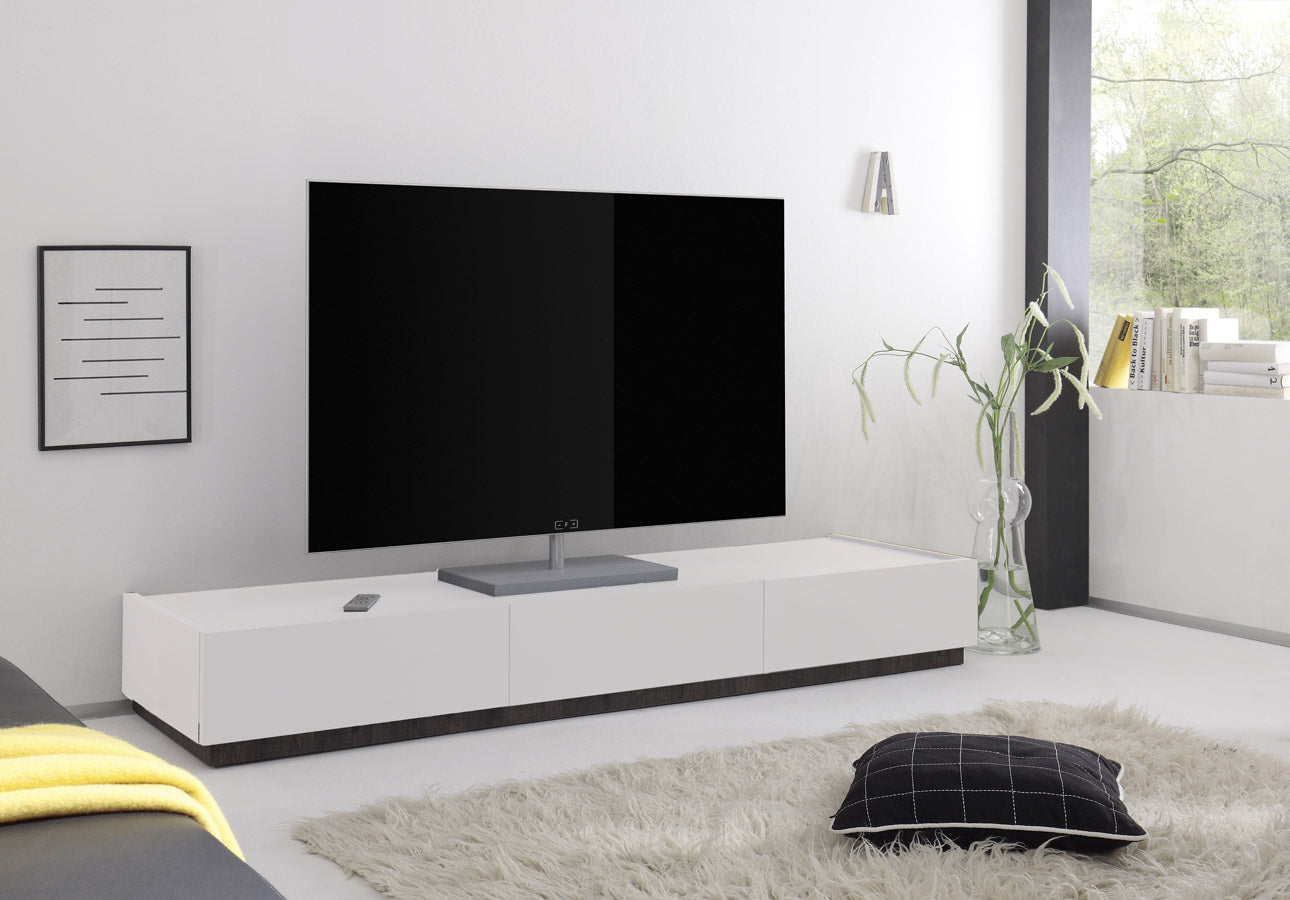 Base porta tv Elexo con 3 cassetti realizzato in legno laccato bianco opaco, un mobile particolarmente basso, progettato appositamente per donare uno stile futuristico a questo modello e al tuo soggiorno. Pratico e funzionale il mobile tv Elexo è disponibile in 2 varianti: con zoccolo wengé o bianco opaco.