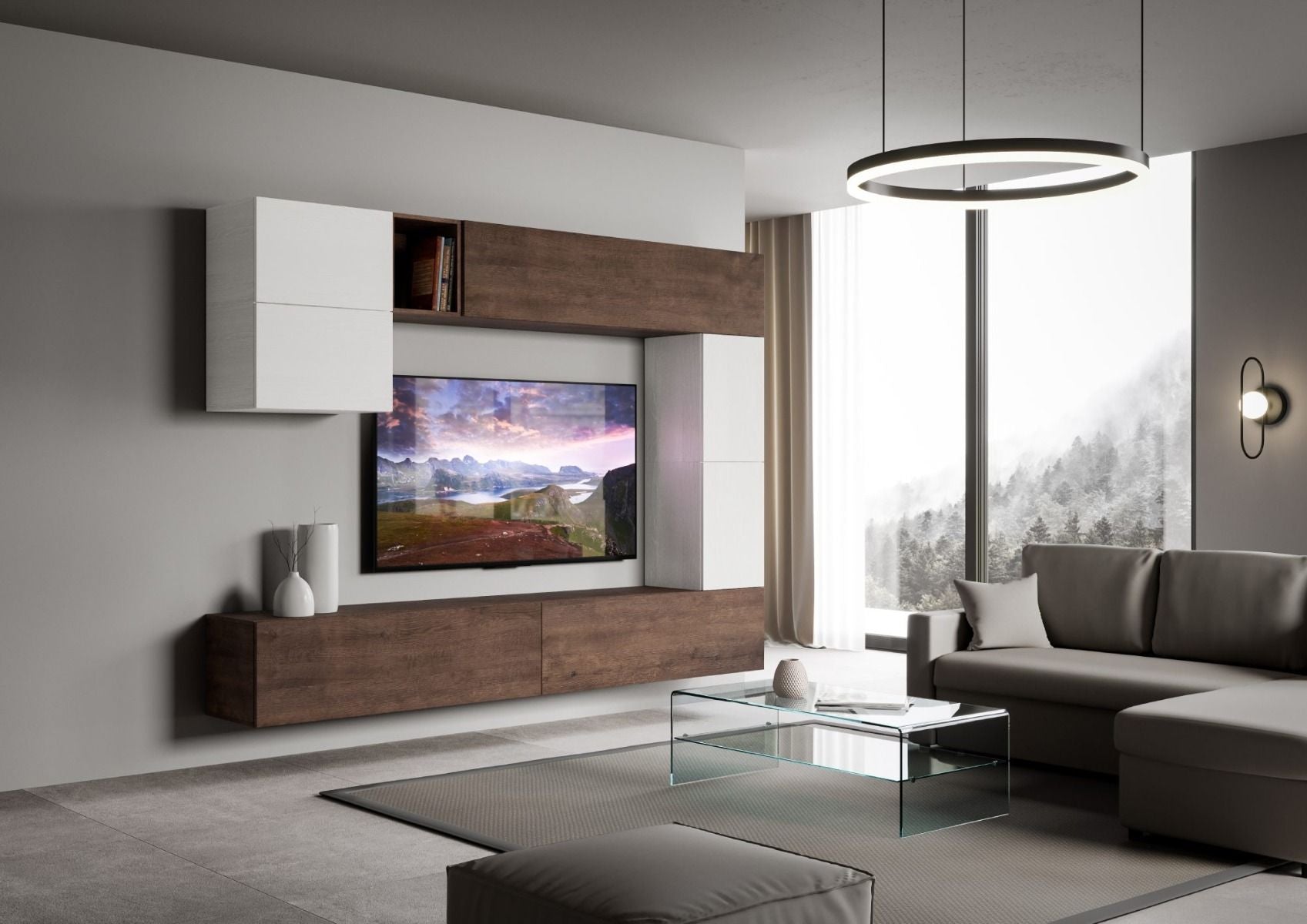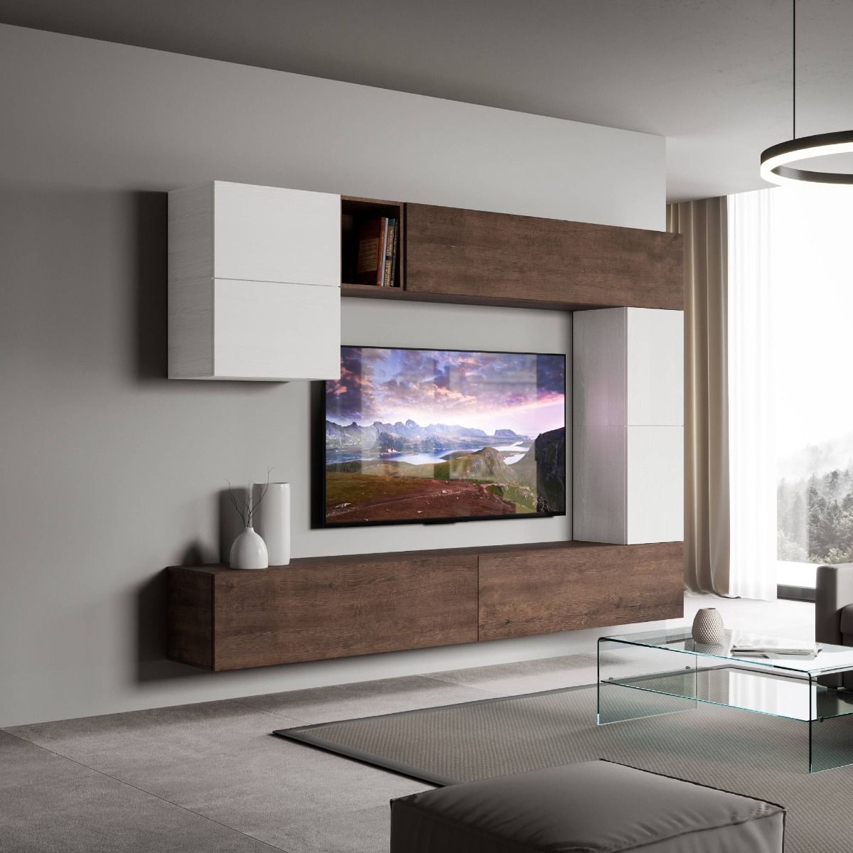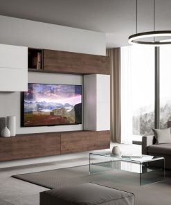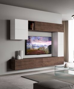 Parete design componibile modello Erika, formata da 7 elementi tutti sospesi e indipendenti, in modo da offrire la possibilità di personalizzare la struttura come desideri.