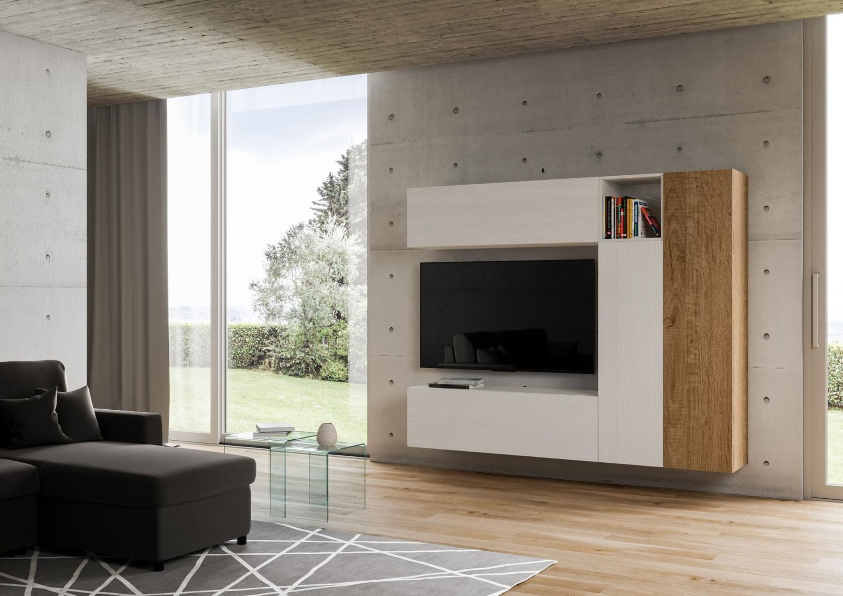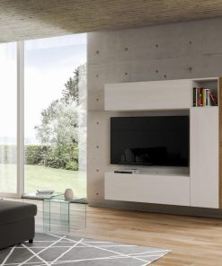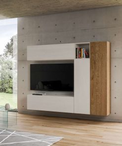Parete moderna da inserire nel tuo salotto o soggiorno, occupando poco spazio. Infatti, Eritrea presenta dimensioni di cm 214, fornita di 4 pensili e un vano a giorno, realizzati in legno bianco frassino e quercia.