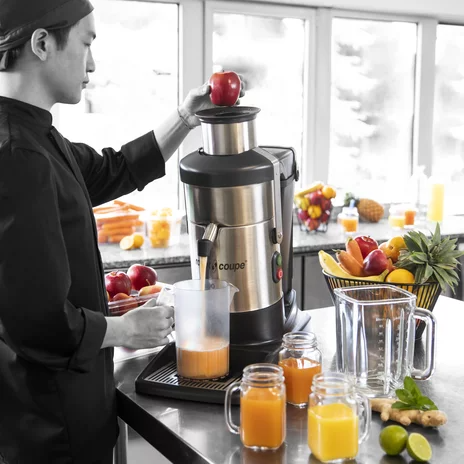 L’Estrattore di Succo J100 di Robot Coupe è uno strumento professionale indispensabile per il settore alberghiero, perfetto per juice bar, ristoranti, e supermercati, dove l’efficienza è fondamentale. La sua tramoggia automatica di forma unica permette di inserire frutta e verdura intere senza necessità di un pressore, garantendo la preparazione rapida di grandi quantità di succo, liberando il personale per altre mansioni. Un punto di forza distintivo è la capacità di estrarre succhi senza riscaldare gli alimenti, preservando così vitamine, nutrienti e antiossidanti, per un prodotto finale di qualità superiore e salutare. Il motore industriale da 1000 W è incredibilmente potente e silenzioso, rendendolo adatto anche per l’uso diretto di fronte ai clienti, senza disturbare l’atmosfera. Dotato di un disco grattugia rinforzato, è costruito per un uso intensivo e una lunga durata nel tempo. L’altezza utile di 251 mm sotto il beccuccio consente di posizionare comodamente anche la vasca di un blender, mentre le due opzioni per l’espulsione dei residui (continua o in un pratico raccoglitore trasparente da 7,2 litri) offrono massima flessibilità e facilità di gestione.