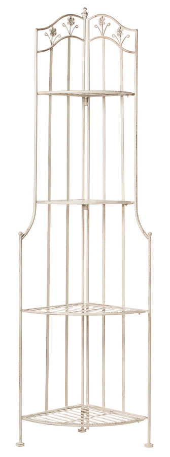 Scaffale etagere ad angolo, realizzato in ferro, compreso di quattro ripiani per vari oggetti. Decorato in superficie con decorazioni a tema floreale, lo scaffale è costruito in stile shabby, il quale dona eleganza alla vostra stanza.