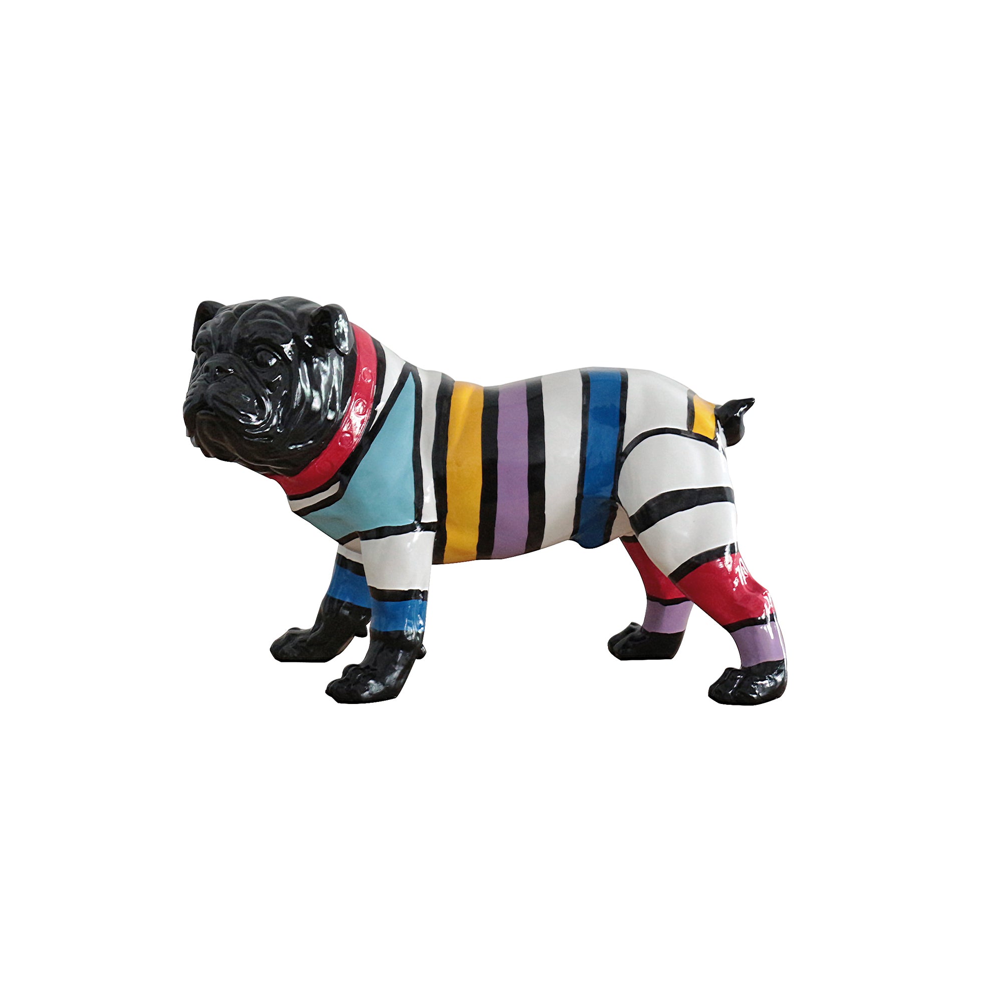 Scultura di stile moderno realizzata da molto esperti artigiani del settore attraverso l’utilizzo di una poliresina molto resistente. La struttura raffigura un cane dal volto nero ed il corpo variopinto da mille colori molto intensi e accesi utilizzati proprio per esaltare la modernità della scultura e tutta la bellezza che mostra nell’ambiente di installazione.