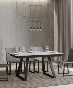 Tavolo allungabile Faviano da cm 160 estensibile a cm 220, piacevole e interessante per mezzo del design innovativo composto da gambe dalla forma di un trapezio che realizzano una struttura alternativa alla solita versione con 4 gambe d’appoggio. Il piano è prodotto in legno in diverse finiture, scegliendo tra classico come noce, country come quercia, trendy come cemento oppure elegante come l’effetto marmo.