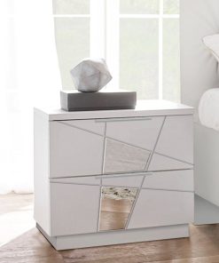Stupendo comodino da camera con 2 cassetti realizzato in legno bianco opaco. Il comodino design Felisio attrae per gli specchi che troviamo sul frontale che producono un effetto di lucentezza e diffonde luminosità ed eleganza. Il comodino moderno presenta una struttura semplice e lineare con disegno serigrafato sul frontale che accompagna la sagoma degli specchi.