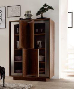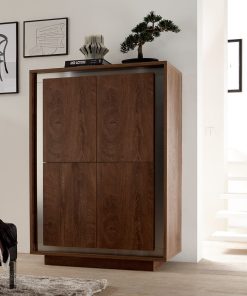 Credenza alta divisa da 4 ante e ripiani interni, un mobile facente parte di una linea di mobili da soggiorno che unisce tradizione e innovazione nello stile. Infatti, la madia moderna Fiammetta pur presentando forme lineari ed essenziali, riprende la classica finitura del legno scura, abbinata ad elementi insoliti come fasce in acciaio a specchio che incorniciano il frontale.