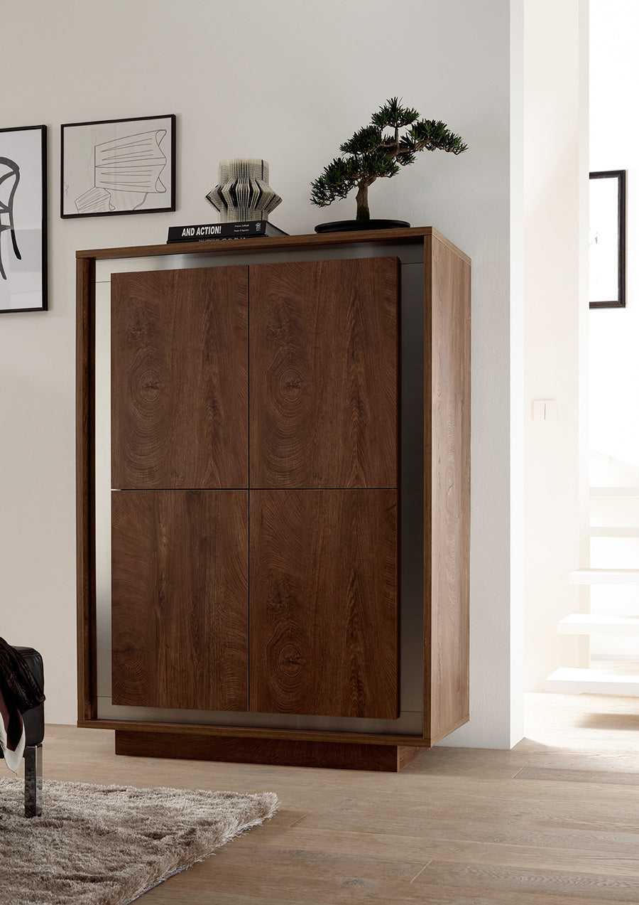 Credenza madia moderna alta e spaziosa, con 4 ante e 8 vani interni. La bellezza di questo mobile living è evidente nella finitura rovere cognac arricchita dalla presenza di fasce in acciaio che la delimitano.