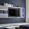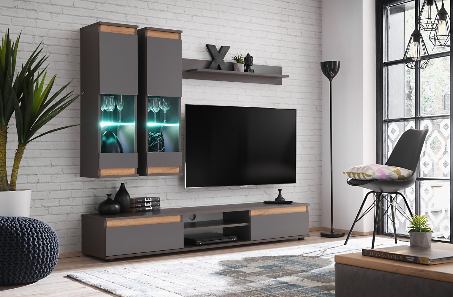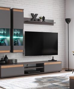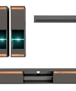 Parete attrezzata Fiona dalle modeste dimensioni, ma sufficiente per rendere il soggiorno pratico ed esteticamente piacevole. Si compone di mobile porta tv, due pensili vetrina e mensola. Fiona presenta superfici in bellissimo colore antracite arricchiti da inserti in finitura quercia natura. Non solo, le luci a led che illuminano le due vetrinette, rendono questa parete living più apprezzata e innovativa.