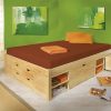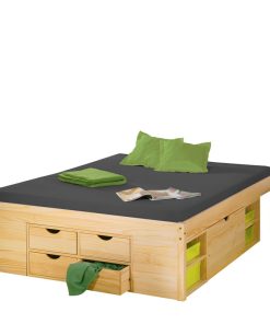 Fantastico letto matrimoniale realizzato in legno massello finitura naturale, formato da una base che funge da vero e proprio mobile, dal momento che include due cassettoni, vani, cassetti e due comodini integrati nella struttura ed estraibili con ruote.