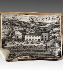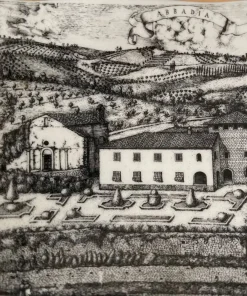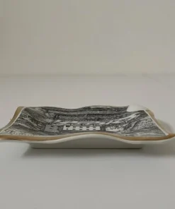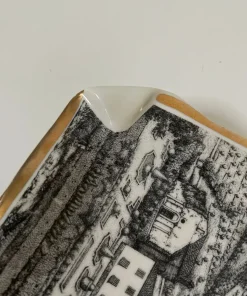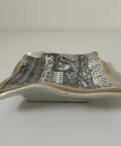 Posacenere in ceramica smaltata e decorata con una serigrafia ripoducente una veduta a volo d’uccello dell’Abbazia Ardenghesca, bordatura dorata.