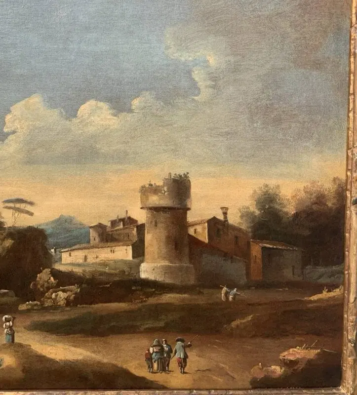 Dipinto antico ad olio su tela, in cornice in legno intagliato, laccato e dorato.