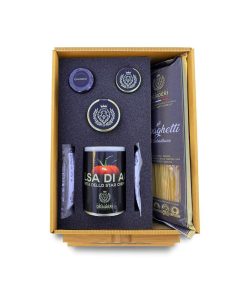 Confezione di gran lusso con tutti gli ingredienti porzionati per preparare una ricetta gourmet firmata da uno dei più grandi interpreti della cucina italiana contemporanea.