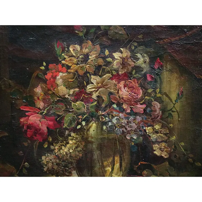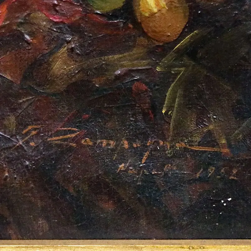 G. Zampogna, Natura morta di fiori e frutti, 1952, Olio su tela, con cornice