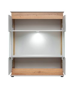 Deliziosa credenza da soggiorno Gelsa perfetta per unire un mobile capiente con una piccola vetrinetta espositiva. Infatti, questa vetrina dal design moderno ed essenziale, si caratterizza proprio per l’apertura centrale vetrata che lascia intravedere i ripiani interni illuminati con luce a led. Prodotta in legno, la piccola vetrina Gelsa associa al grigio chiaro delle ante, gli inserti rovere chiaro della struttura, ottenendo un connubio equilibrato, sempre valido e gradevole ovunque.