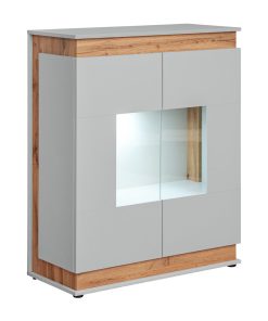 Deliziosa credenza da soggiorno Gelsa perfetta per unire un mobile capiente con una piccola vetrinetta espositiva. Infatti, questa vetrina dal design moderno ed essenziale, si caratterizza proprio per l’apertura centrale vetrata che lascia intravedere i ripiani interni illuminati con luce a led. Prodotta in legno, la piccola vetrina Gelsa associa al grigio chiaro delle ante, gli inserti rovere chiaro della struttura, ottenendo un connubio equilibrato, sempre valido e gradevole ovunque.