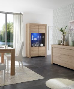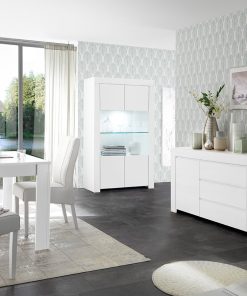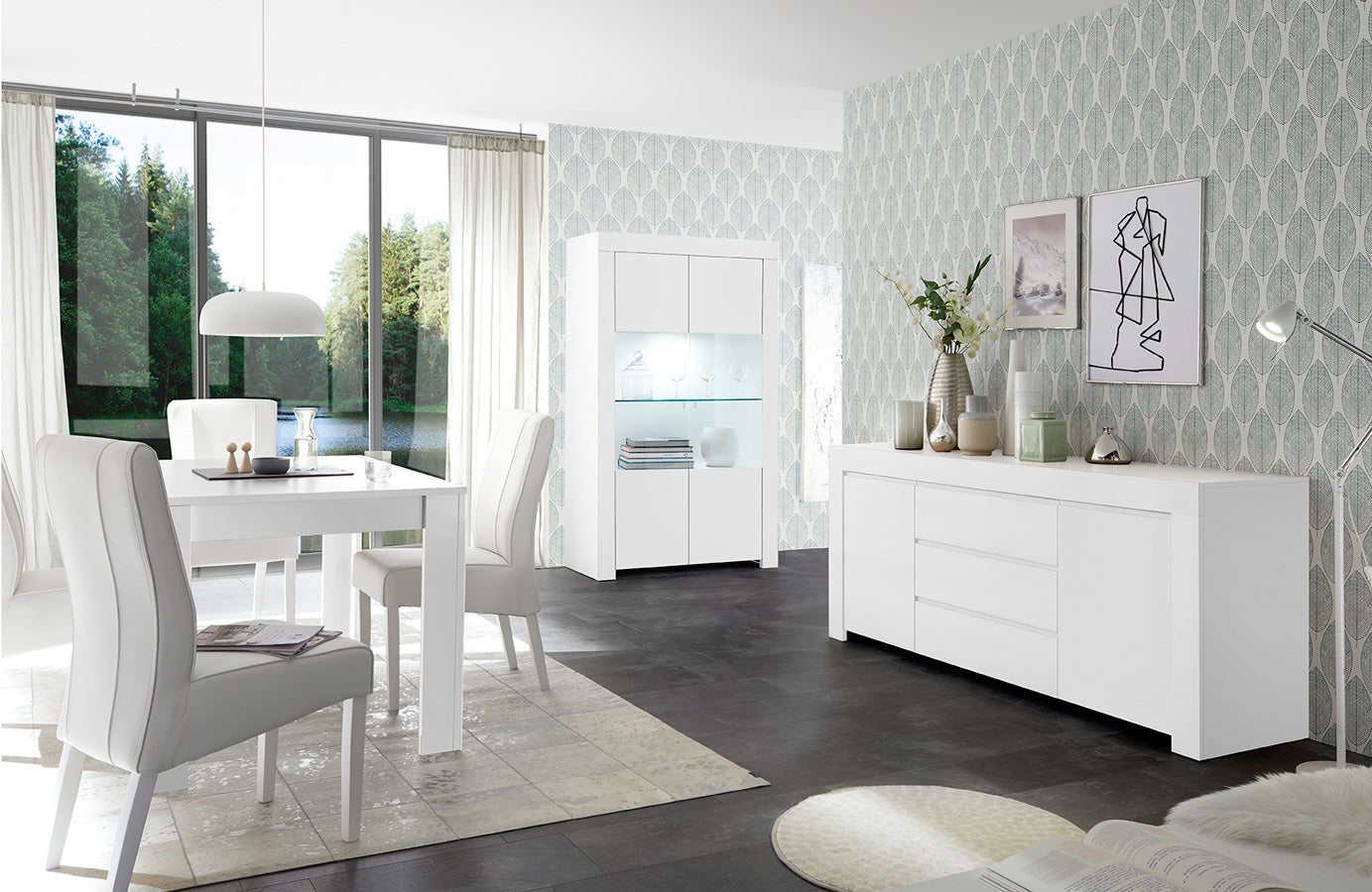 La nostra idea di soggiorno completo si arricchisce di una graziosa e spaziosa vetrina con 2 ante. Infatti, la sala da pranzo Genk include, oltre alla vetrina, anche una credenza con 2 ante e 3 cassetti centrali e tavolo allungabile. Disponibile sia in bianco opaco che rovere, Genk rientra in una serie di mobili basati su un design lineare e minimale, con maniglie a gola per semplificare al massimo lo stile.