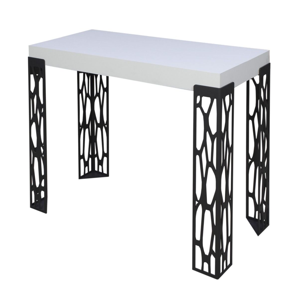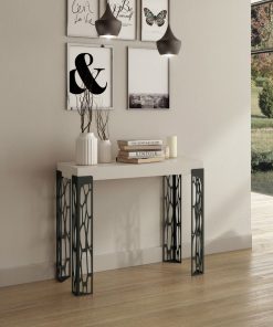Consolle da ingresso allungabile modello Ghibli versione Small, un mobiletto dal design esclusivo e funzionale che sfrutta un efficiente meccanismo di estensione, che consente di raggiungere una lunghezza di cm 196. La consolle moderna Ghibli si contraddistingue per le gambe in metallo traforate accompagnate da piano in legno finitura bianco frassino.