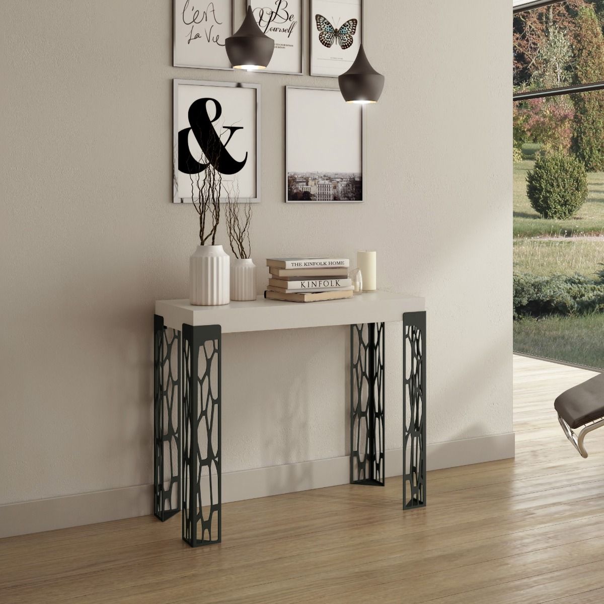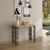 Stupefacente consolle da ingresso, caratterizzata da forme astratte grazie al metallo lavorato a traforo, che realizzano un design d’avanguardia e indubbiamente originale. Infatti, la consolle moderna Ghibli spicca per le gambe in metallo dalla sezione triangolare con elementi forati che creano una trama accattivante, tutto questo accompagnato da piano in legno bianco frassino.