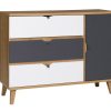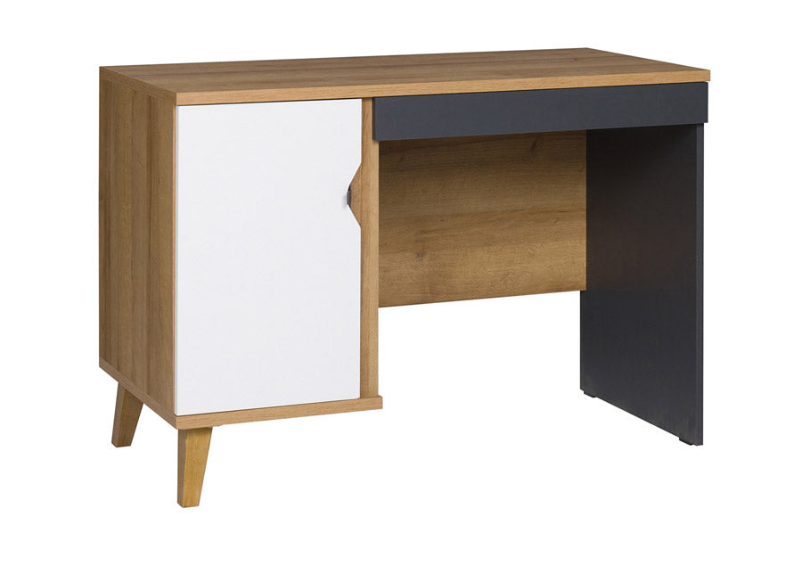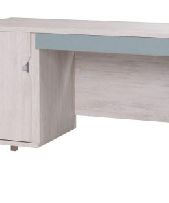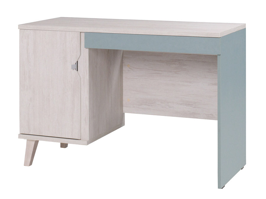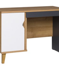 Scrivania moderna con cassetto e anta realizzata in legno, funzionale e distinta da un abbinamento di colori pensato per donare una nota di colore, per un arredo fresco ed alternativo. La scrivania da studio presenta dimensioni medie da cm 110, facile da inserire in qualsiasi ambiente, da associare ad altri mobili della linea per soggiorno o camera da letto. Potrai scegliere tra due versioni: struttura finitura naturale con bianco e grigio scuro, oppure una variante con toni chiari del bianco e del celeste.