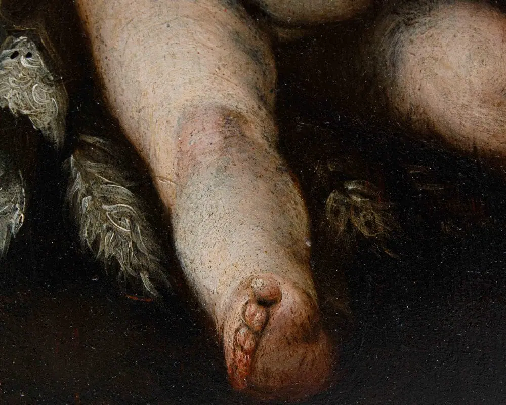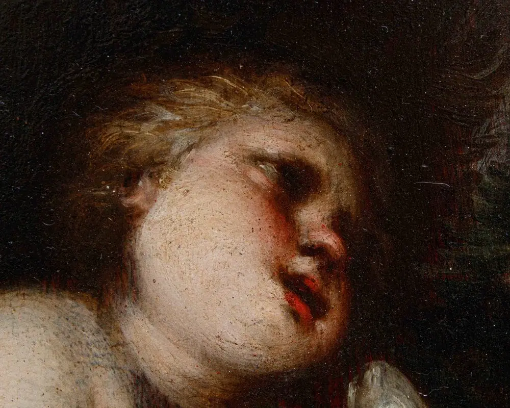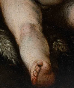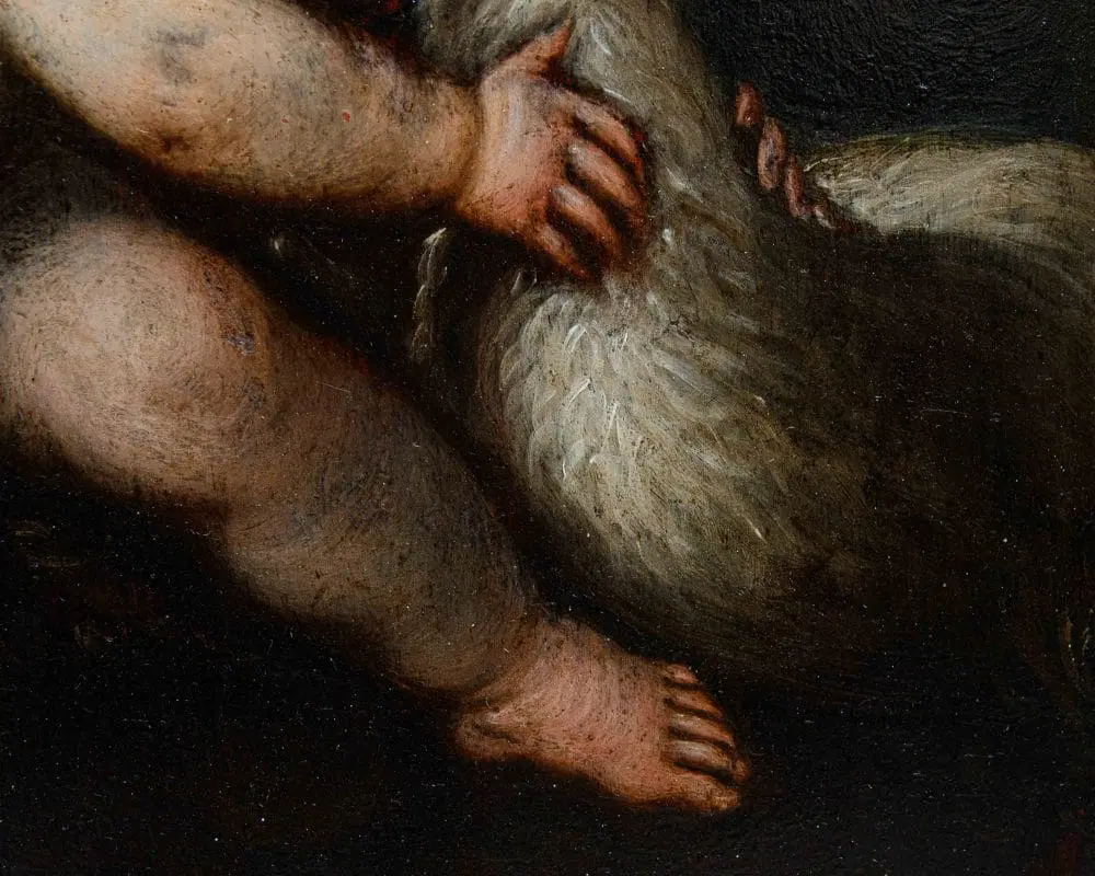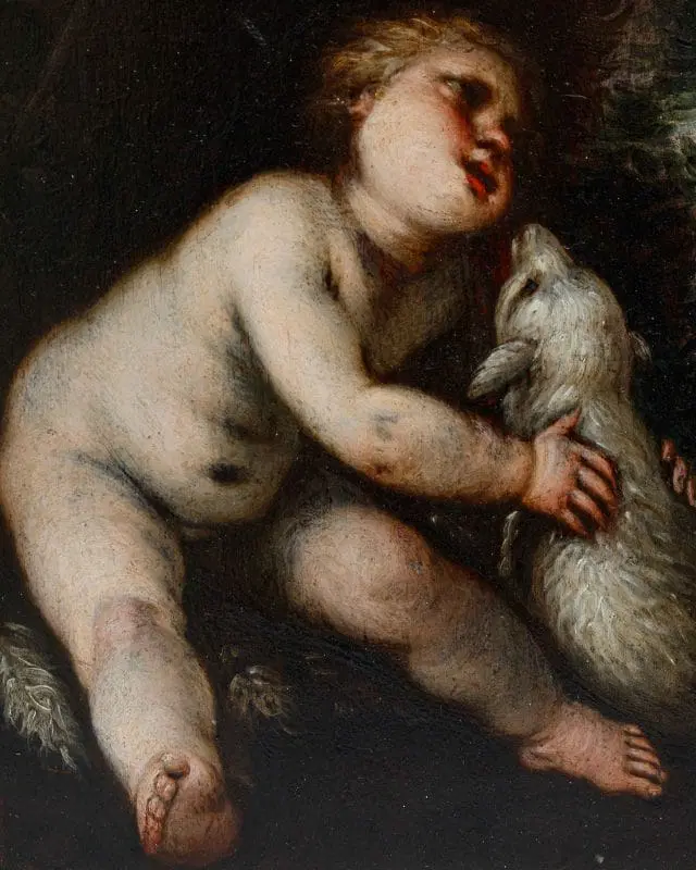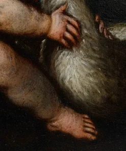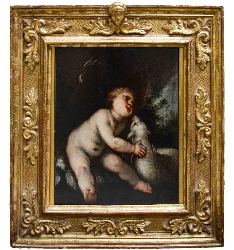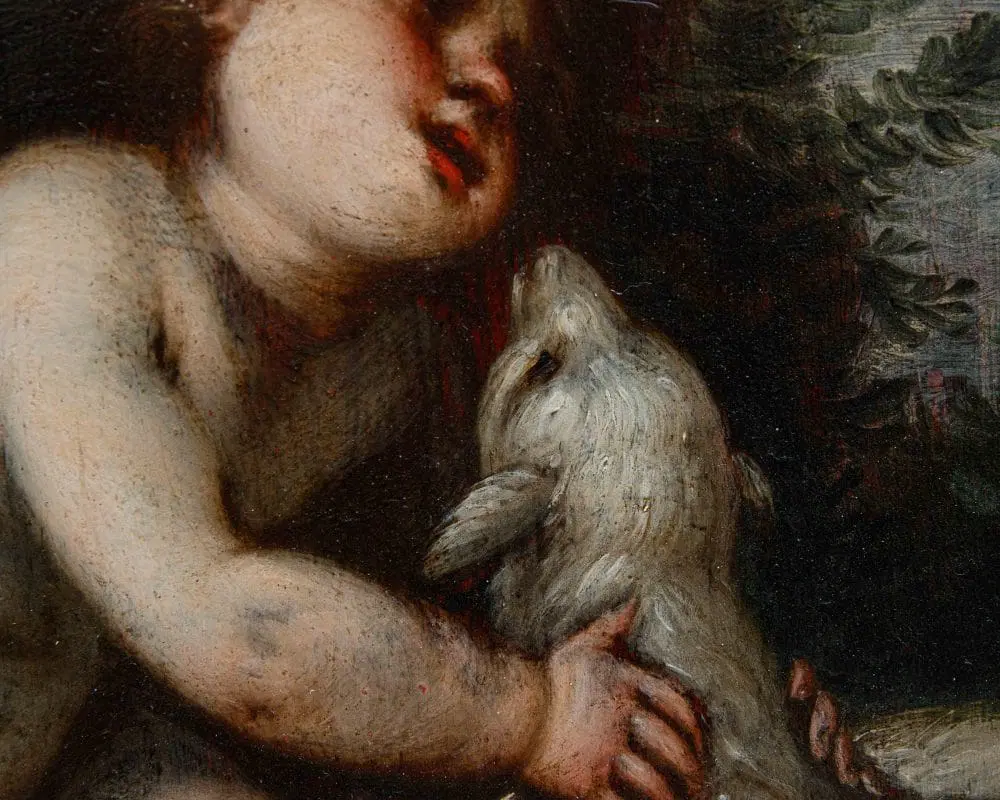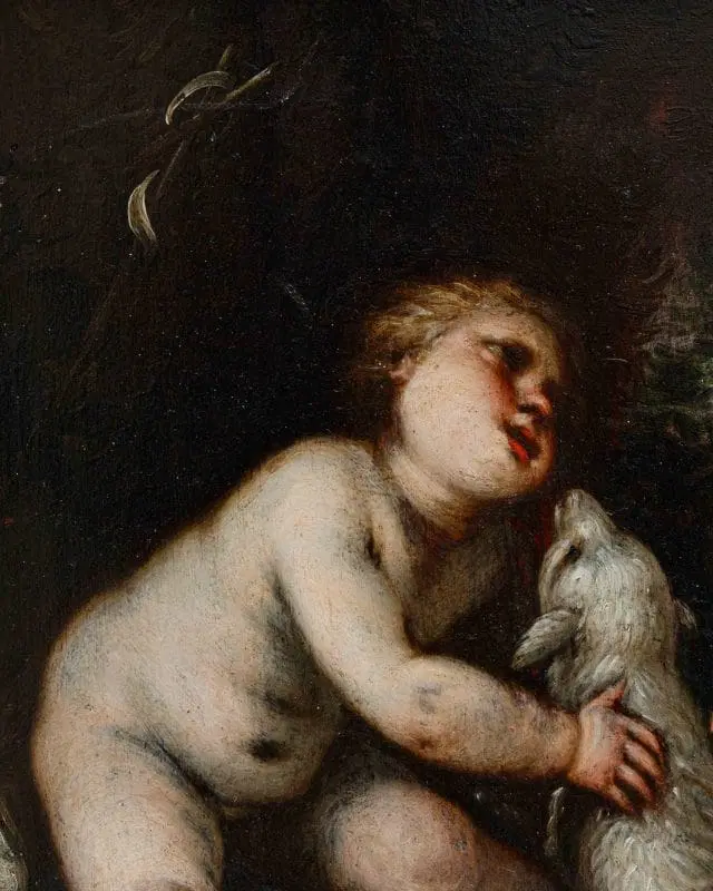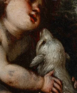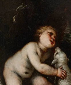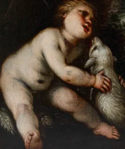 L’opera qui presentata costituisce, insieme a quella conservata presso i Musei Civici di Monza, una delle due versioni del San Giovannino con l’agnello realizzate dal pittore bergamasco Giovanni Stefano Danedi detto il Montalto (Treviglio, 1612 – Milano, 1690), fra i più prolifici e significativi interpreti della pittura barocca in Lombardia. I formalismi tipici dell’artista, ricorrenti estesamente all’interno del suo corpus pittorico, quali la carica emotiva conferita dalla calda luminosità ed i forti contrasti chiaroscurali, caratterizzano anche la tela in esame, nella quale il San Giovannino, nudo e seduto a terra su quella che secondo l’iconografia è un lembo di pelle di cammello, viene immortalato intento ad accarezzare l’agnellino accucciato vicino a lui, in un ambiente boschivo molto scuro e scarsamente visibile. La tela è ricca di richiami iconografici riassunti dall’abbraccio del santo verso l’agnello: come narrato nei Vangeli, fu proprio Giovanni Battista adulto ad indicare come “agnello di Dio” Gesù, che si era recato lungo le rive del Giordano per ricevere il battesimo.