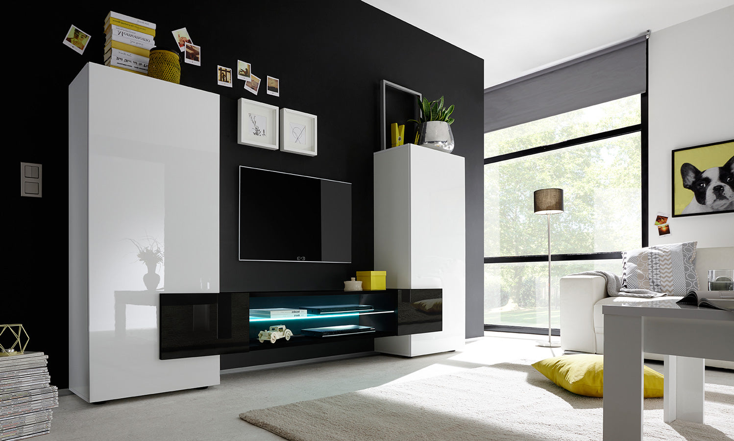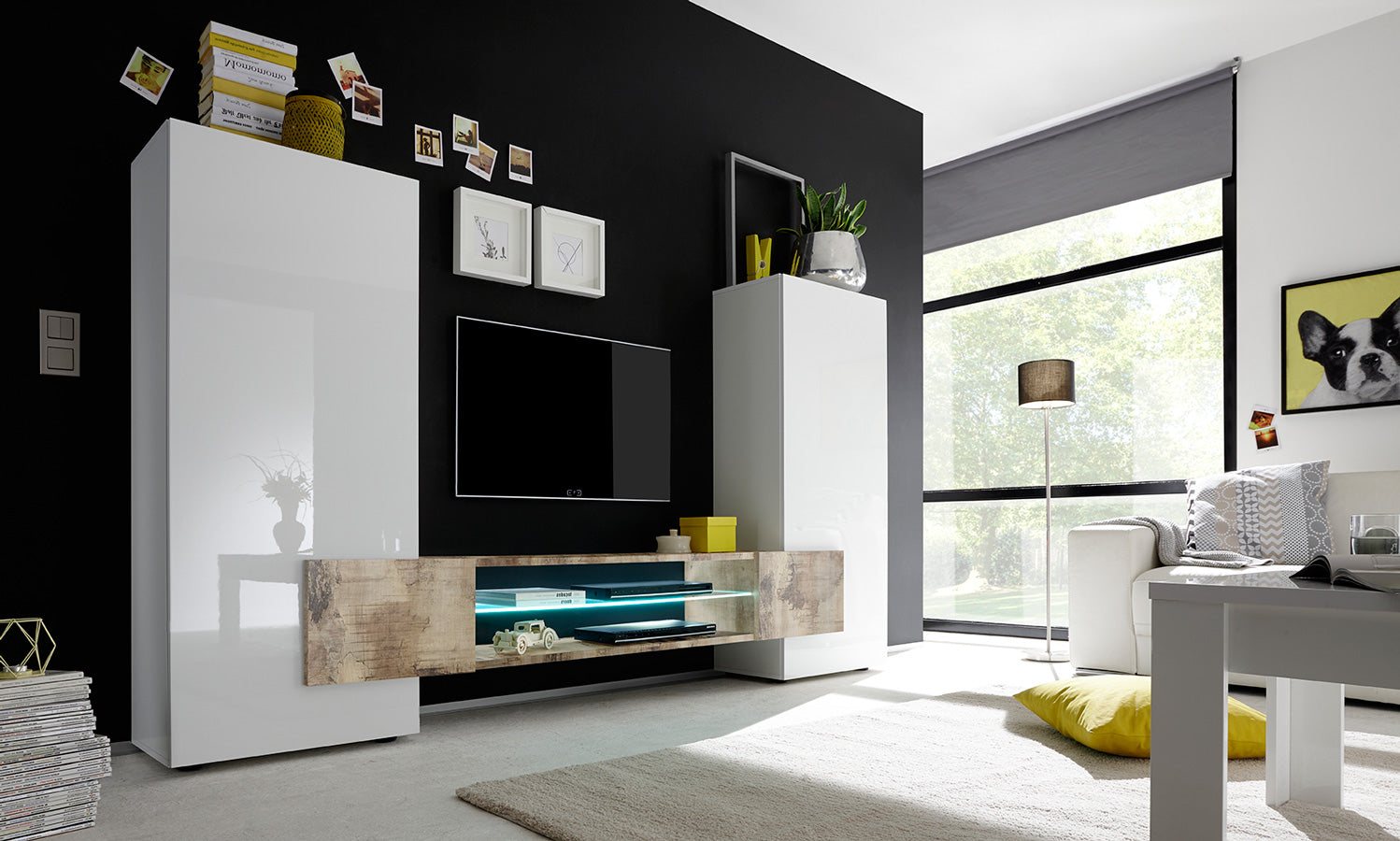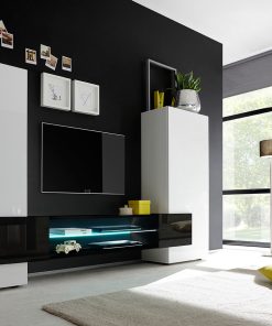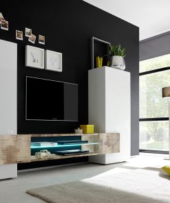 Il design essenziale e moderno della parete living, mette in risalto le superfici lucide del bianco che compone la struttura, a questa, contrasta il porta tv disponibile in 3 diversi colori: nero, cemento o pero.