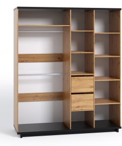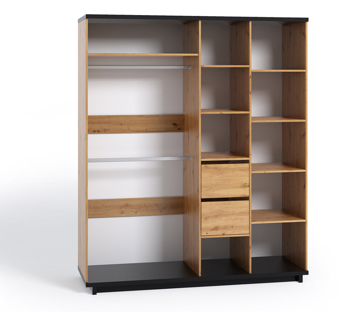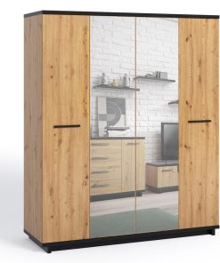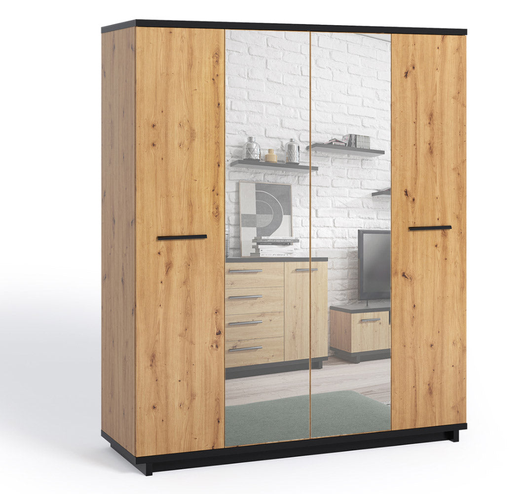 Armadio moderno per camera da letto composto da 4 ante di cui 2 con specchio. Realizzato in legno in una finitura naturale, l’armadio si caratterizza anche per il contrasto del nero opaco che troviamo sul top e sulla base. Il nostro guardaroba è completo internamente di tutto: appendiabiti, ripiani e cassettiera con 2 cassetti.