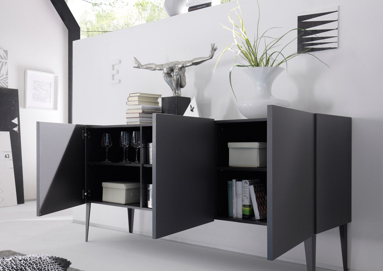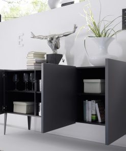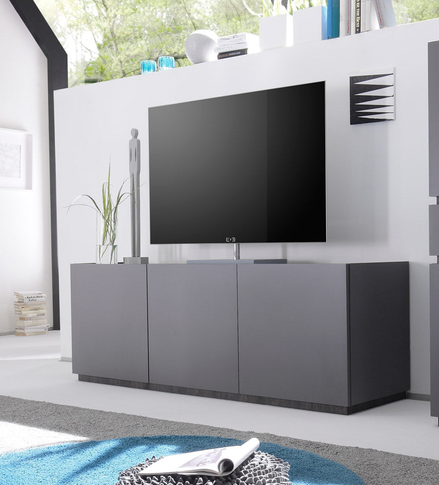 Mobile da soggiorno 3 ante Glory, prodotto in legno grigio opaco dal design essenziale e pulito. La credenza è dotata di ripiani interni, ampia e pratica, utile anche come porta televisore. Potrai scegliere il colore dello zoccolo inferiore tra grigio o wengé. Glory è un prodotto Made in Italy resistente e durevole, con un ottimo rapporto qualità-prezzo.