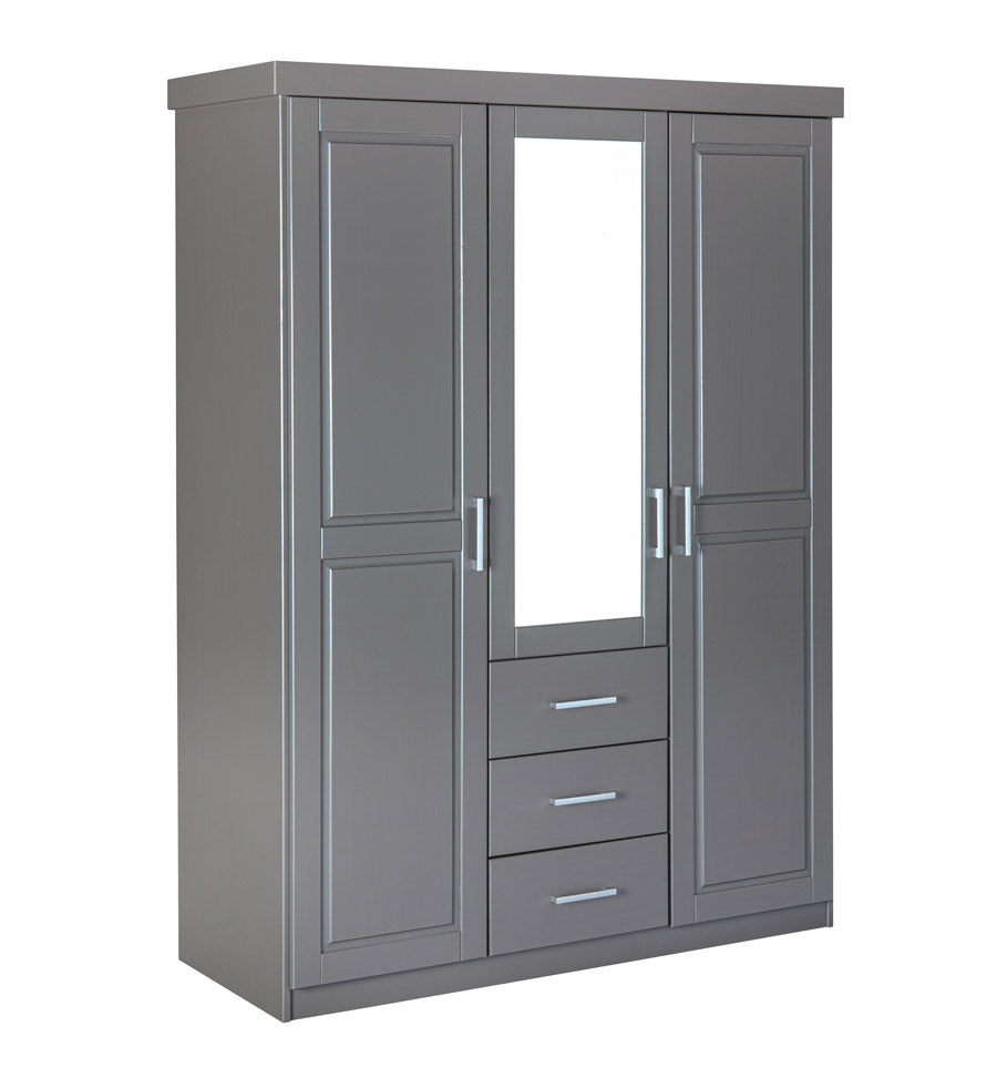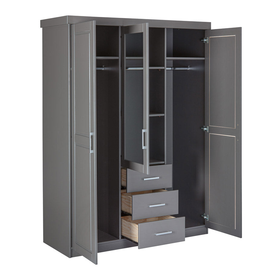 Armadio moderno 3 ante con cassetti e specchio in legno massello grigio