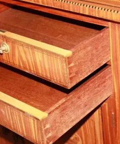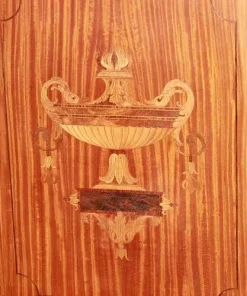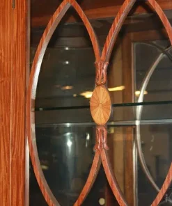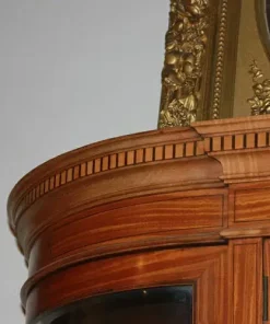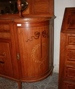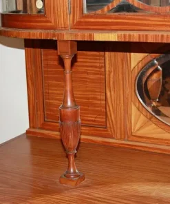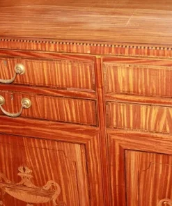 Grande bellissima credenza inglese della seconda metà 1800, stile Sheraton, in legno satinwood. Presenta corpo superiore formato da 4 ante a vetrina con internamente specchi e ripiani in cristallo, corpo centrale a giorno con colonnine intagliate mentre il corpo inferiore e dotato di 4 ante chiuse e 4 cassettini sottopiano. Tutto il corpo della credenza è imprezisito da motivi di intarsio e filettatura di intarsio.