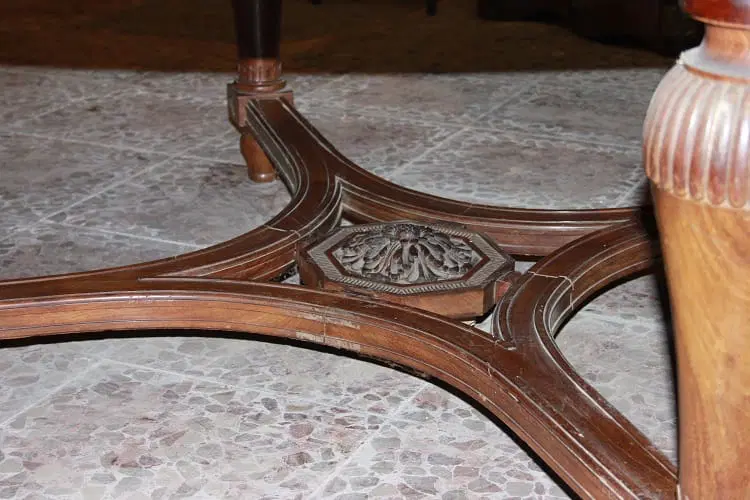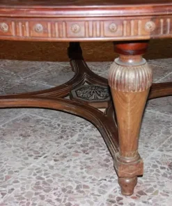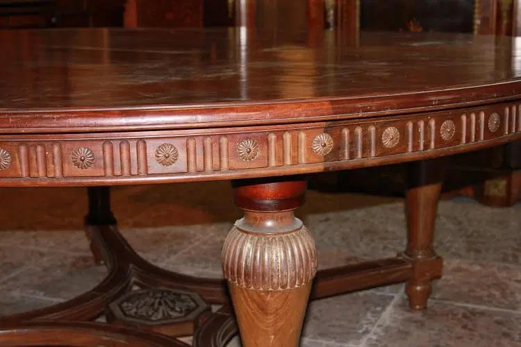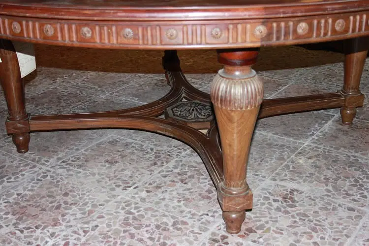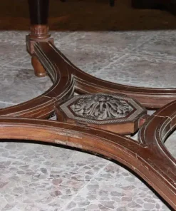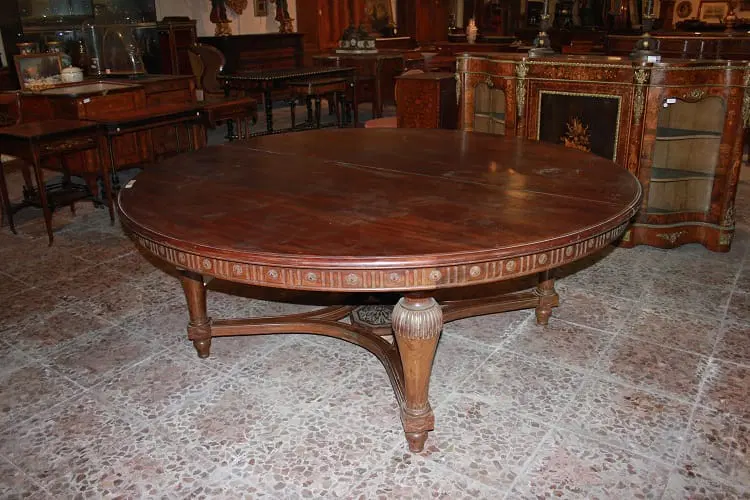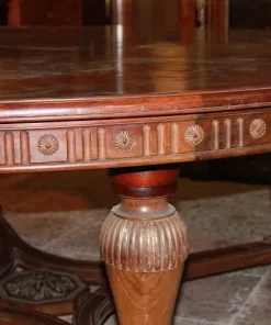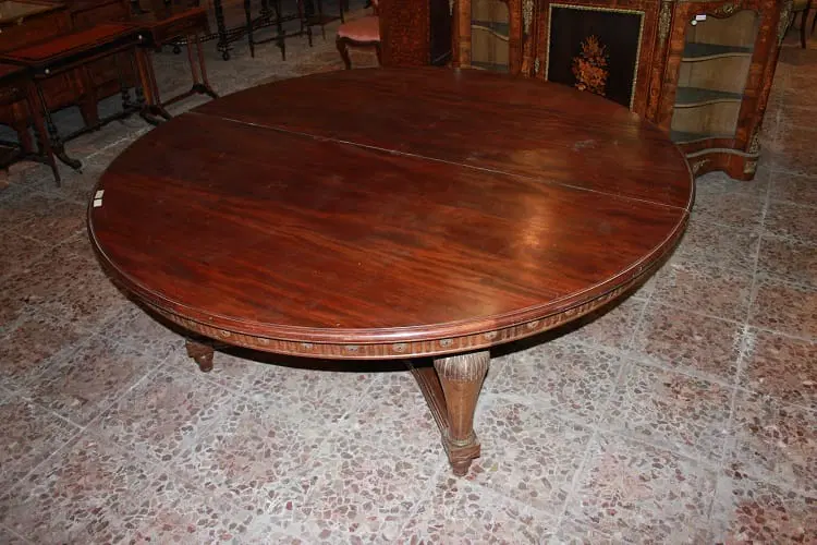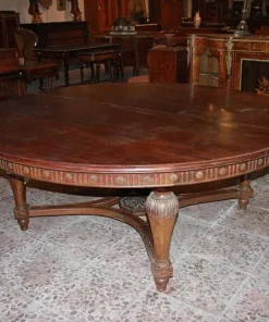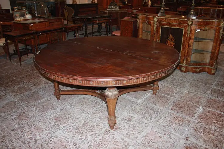 Grande tavolo francese di inizio 1800, stile Luigi XVI, in legno di mogano. Presenta un diametro di 2 metri chiuso, allungabile a 4.20 metri, bordatura del piano rifinita con motivi di intaglio, termina con grande crociera a riunire le gambe nel corpo inferiore.